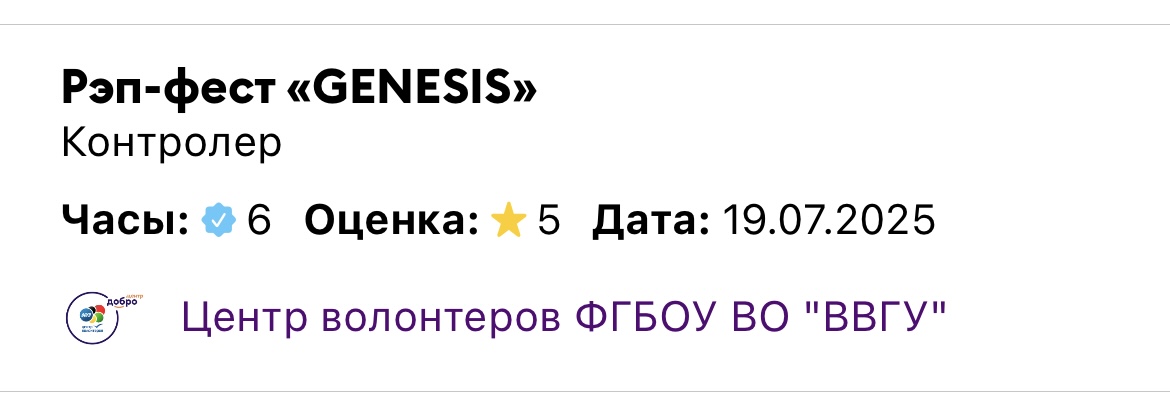 Реп-фест «Genesis » Городской, краевой 19.07.2025 Контроллер Волонтерская книжка