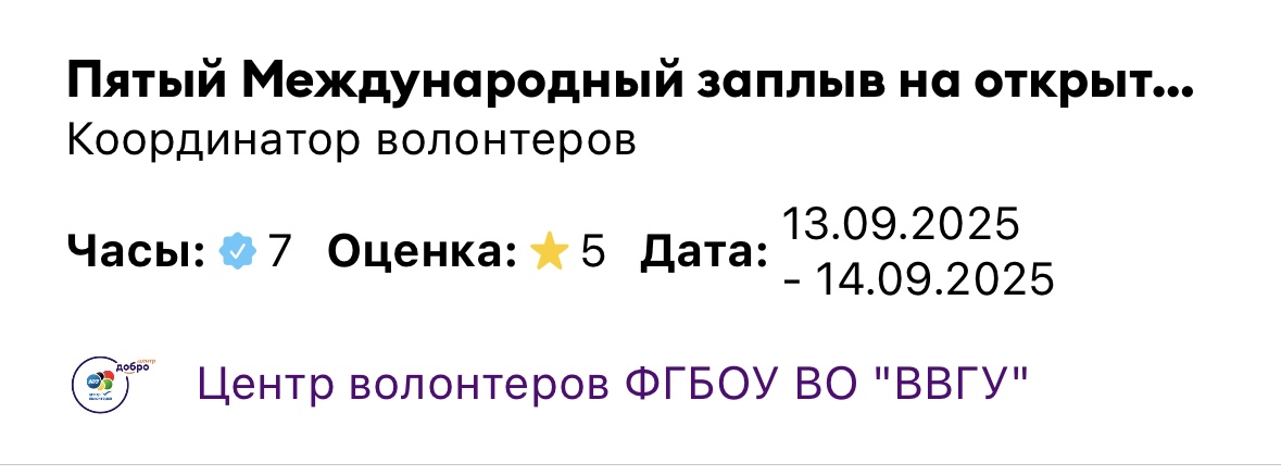Пятый международный заплыв X-Waters Vladivostok 2025 Международный 13.09.2025 Координатор волонтеров Волонтерская книжка