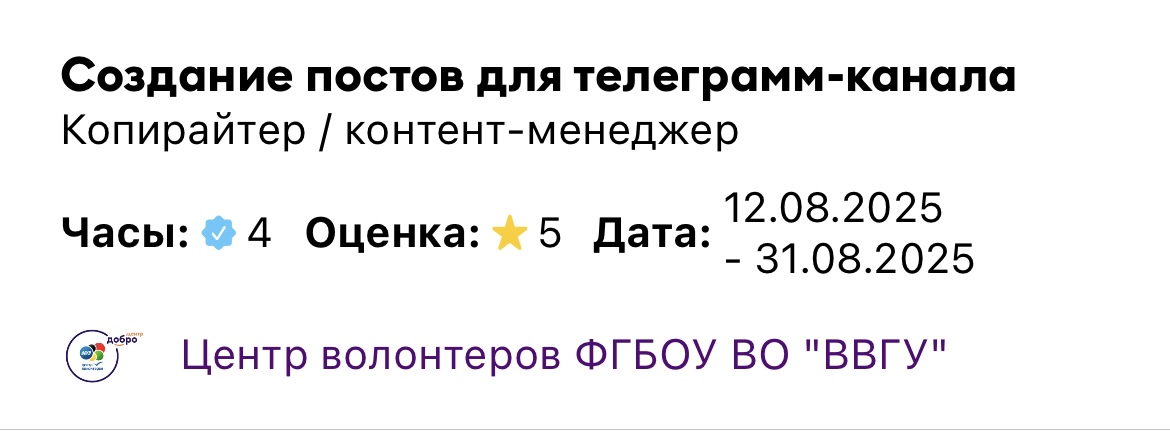Создание постов для телеграмм-канала Внутривузовский 12.08.2025 - 31.08.2025 Копирайтер/ контент-менеджер Волонтерская книжка