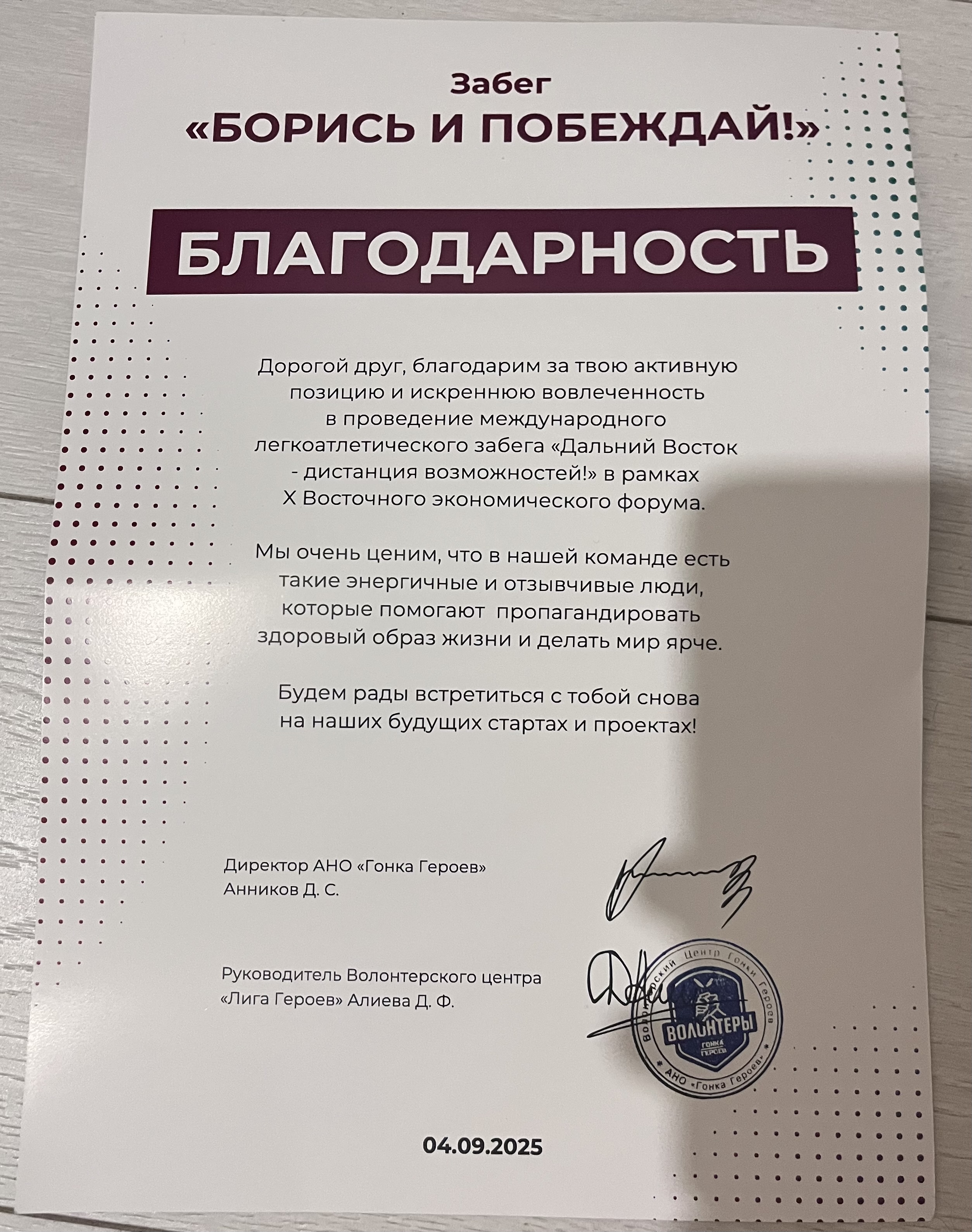 Забег «Борись и побеждай» в рамках ВЭФ 2025 Международный 04.09.2025 Волонтер Благодарность и...
