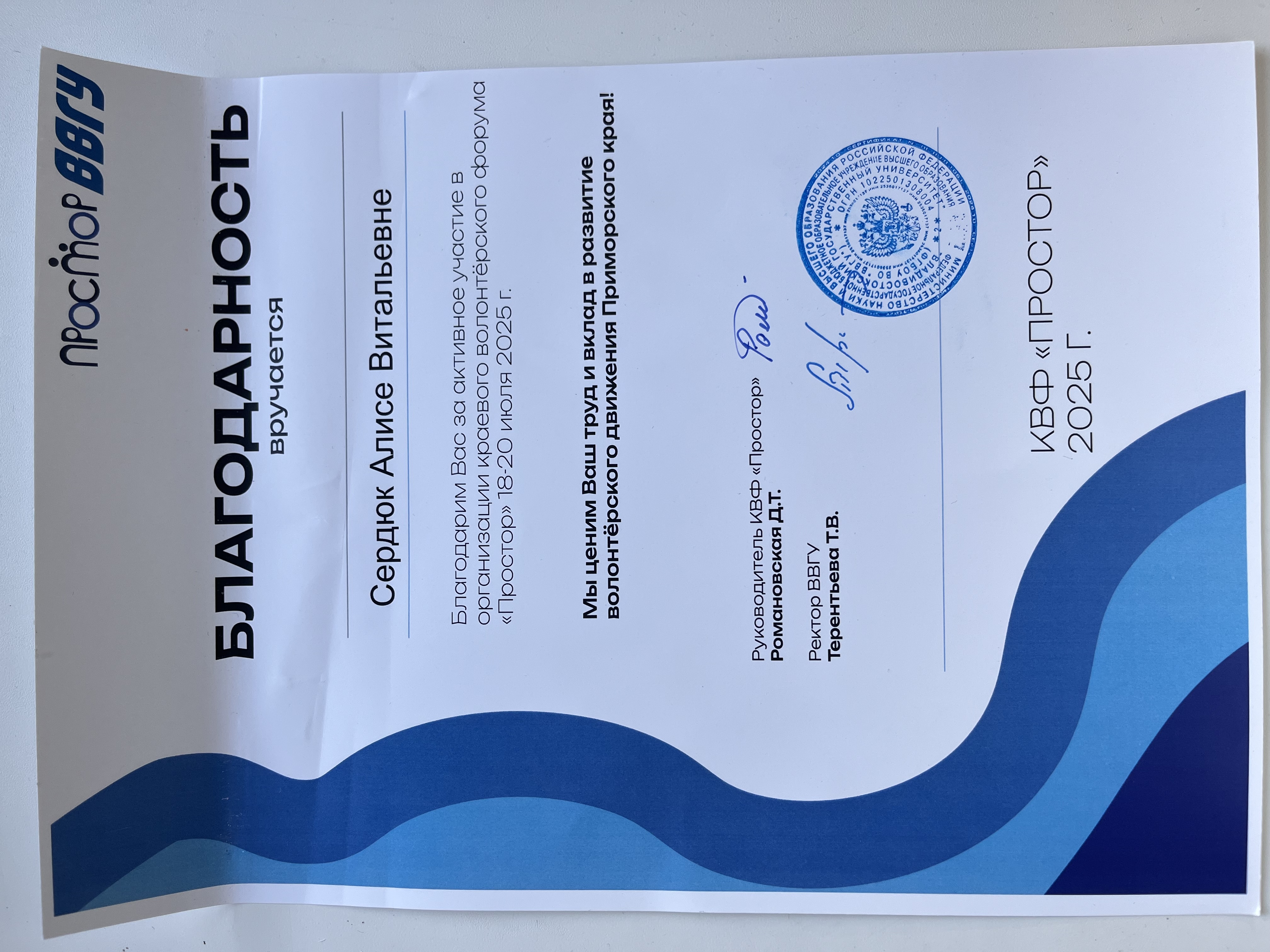 День рождения Центра Волонтеров ВВГУ Городской, краевой 24.05.2025 Благодарность Благодарность