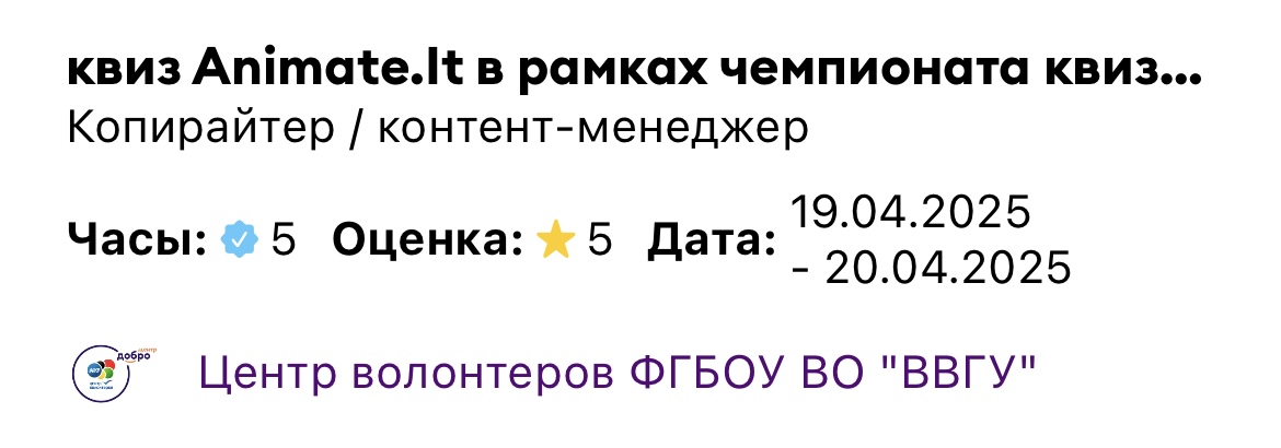 Квиз Animate.it в рамках Чемпионата Квиза ЦВ ВВГУ+АК ВВГУ | Внутривузовский | 19.04.2025 - 20.04.2025 | Копирайтер/контент-менеджер |