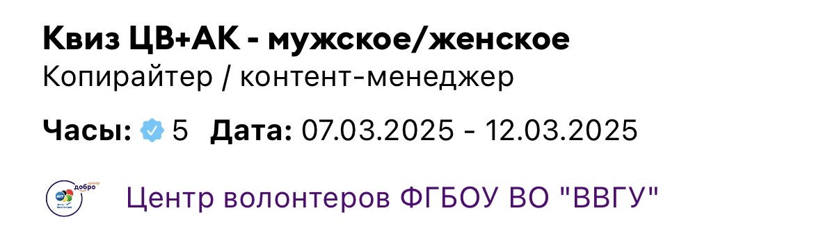 Квиз ЦВ+ АК ВВГУ «Мужское/Женское» | Внутривузовский | 07.03.2025 - 12.03.2025 | Копирайтер/контент-менеджер |