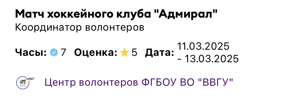 Домашние матчи ХК «Адмирал» | Городской, краевой | 04.03.2025 | Координатор движения людских потоков | Волонтерская книжка | |||