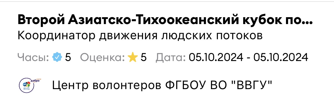 Второй Азиатско- Тихоокеанский кубок по беговелам | Городской, краевой | 05.10.2024 | Волонтер |
