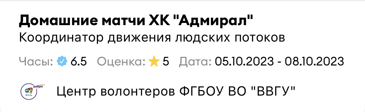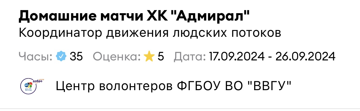 Домашние Матчи ХК «Адмирал» | Городской, краевой | 17.09.2024 - 26.09.2024 | Координатор движения людских потоков все 5 матчей |