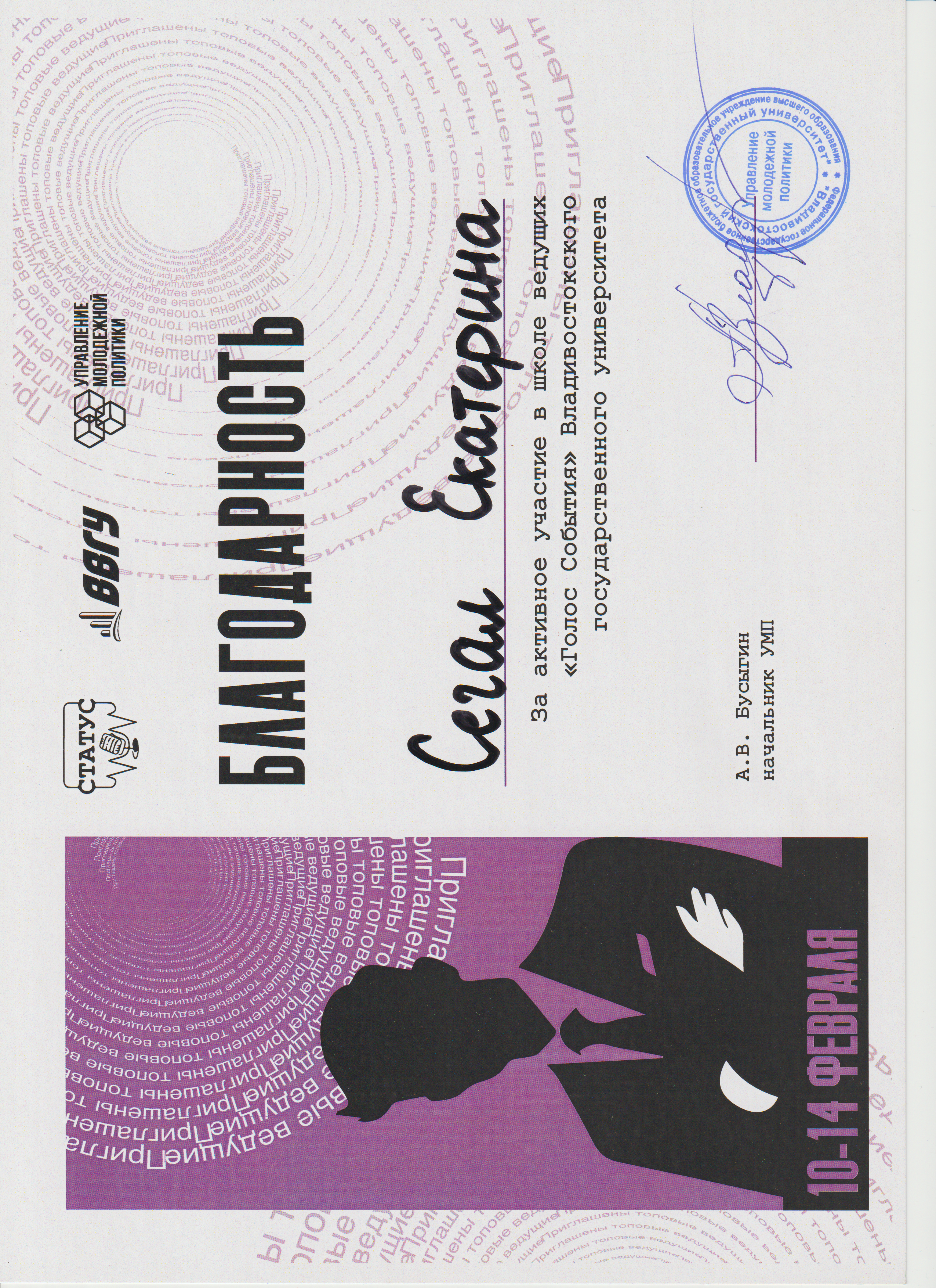 Школа ведущих "Голос события" | Обучающие тренинги | Внутривузовский | 10.02.2025 - 14.02.2025 | Участник |