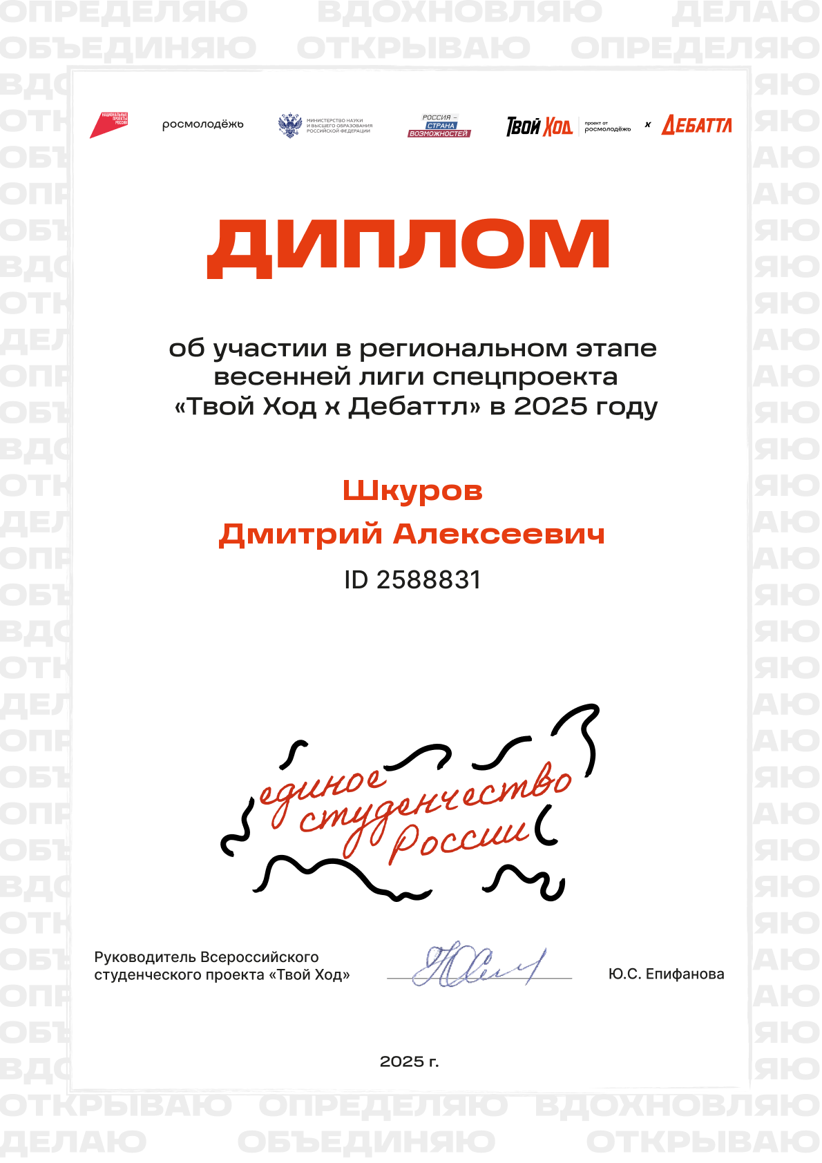 Региональный этап весенней лиги спецпроекта «Твой Ход х Дебаттл» в 2025 году | Региональный | 12.04.2025 - 12.04.2025 | Победитель |