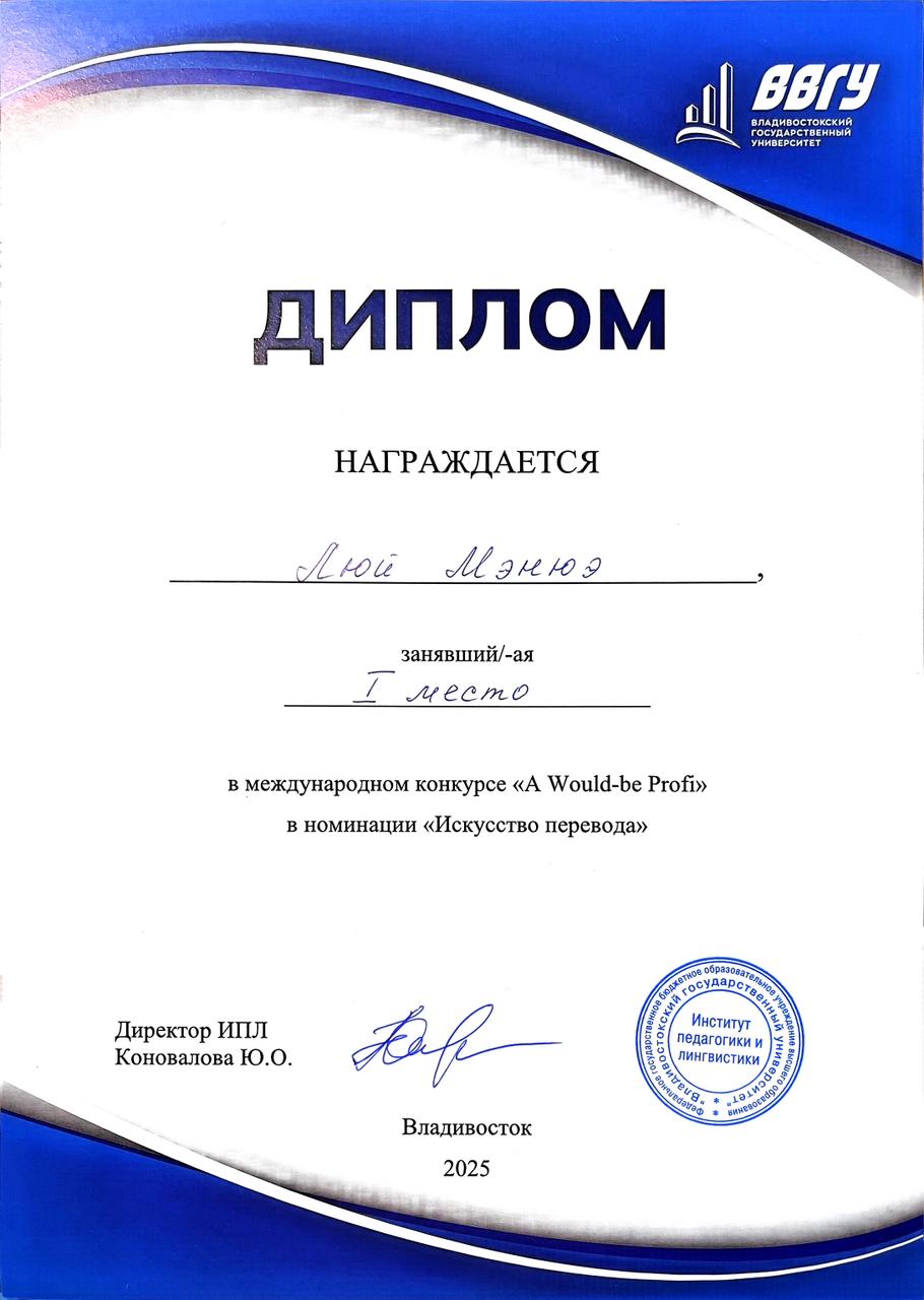 | Международный конкурс «A would-be Profi» | Международный | 10.10.2025 - 10.10.2025 | 1 место или гран-при |