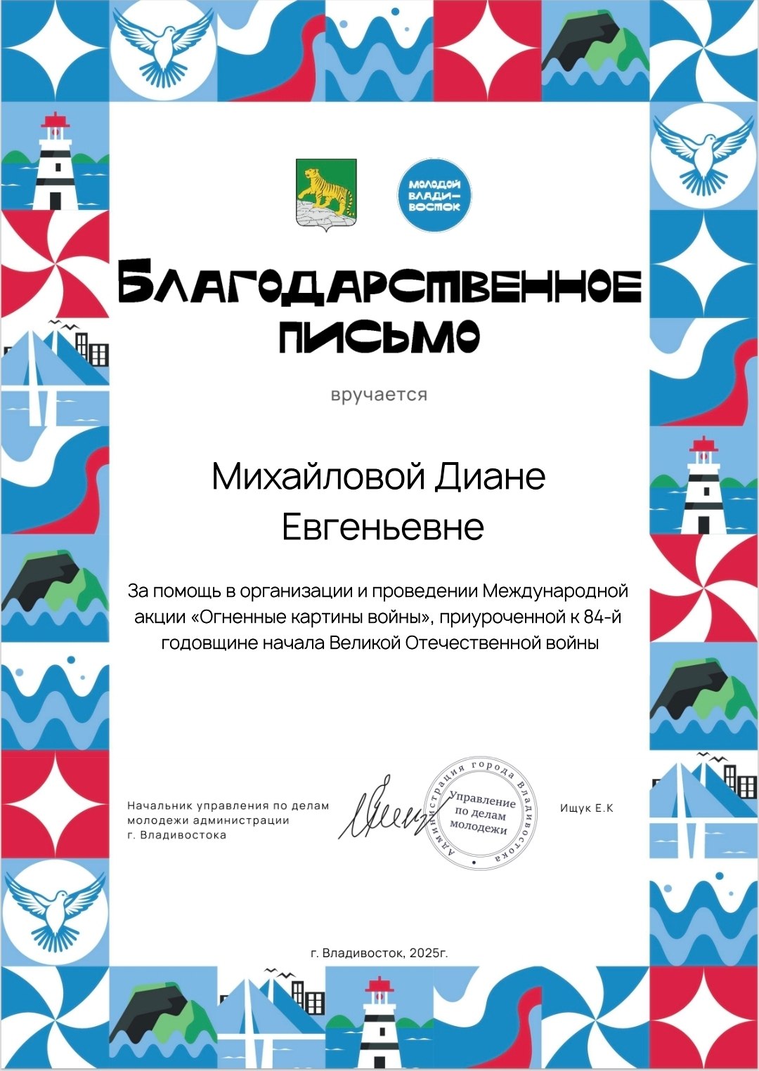| Международная акция "Огненные картины войны" | Городской, краевой | 22.06.2025 - 22.06.2025 | Участник |