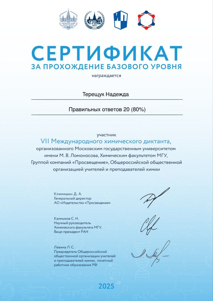 "VII Международный химический диктант" | Международный | 17.05.2025 | Участник |