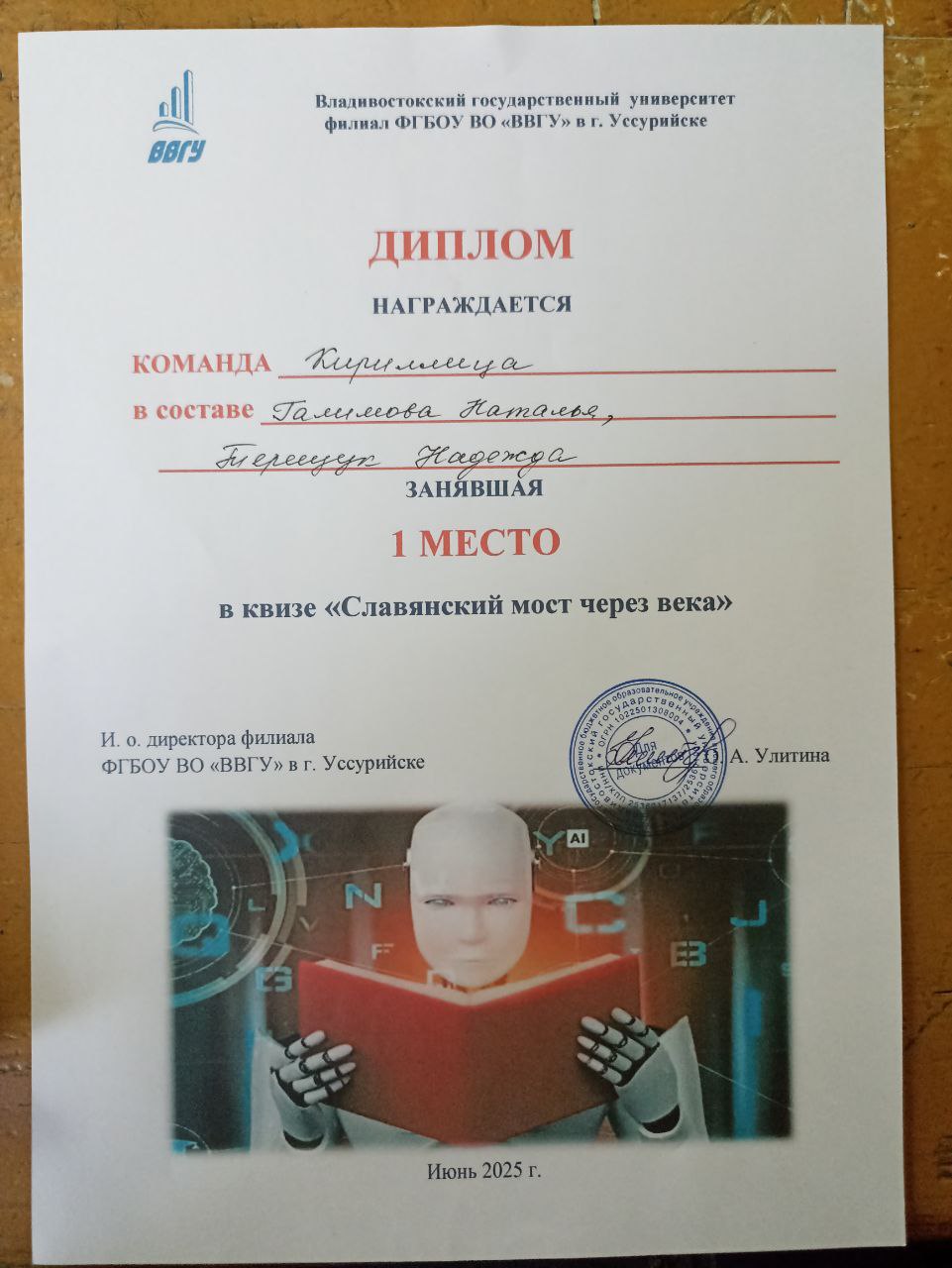 Квиз "Славянский мост через века" | Внутривузовский | 05.06.2025 | 1 место или гран-при |