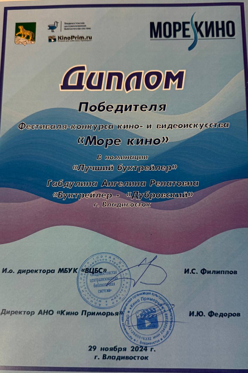 Фестиваль-конкурса кино и видеоискусства "Море кино" | Городской, краевой | 15.11.2024 - 29.11.2024 | Победитель |