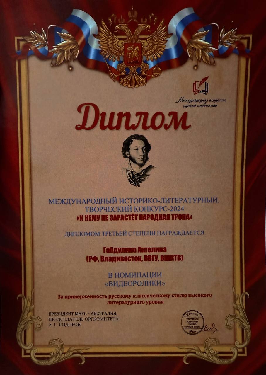 Международный историко-литературный,творческий конкурс-2024 "К нему не зарастёт народная тропа" | Международный | 15.03.2024 - 15.02.2025 | Диплом |