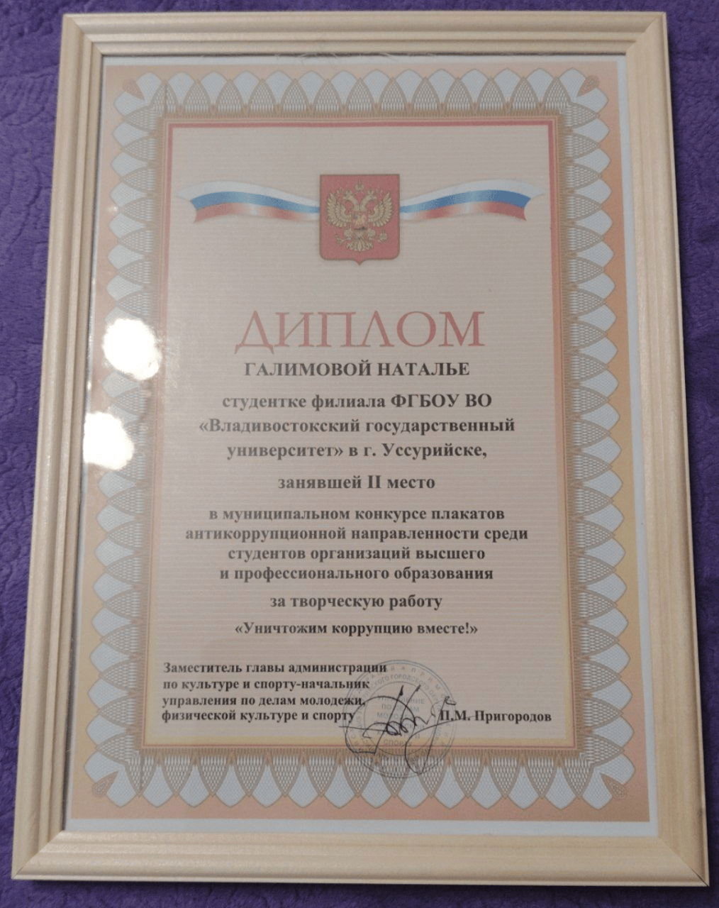| Муниципальный конкурс плакатов антикоррупционной направленности среди студентов организации высшего и профессионального образования г. Уссурийска | Городской, краевой | 19.12.2025 - 19.12.2025 | 2 место |