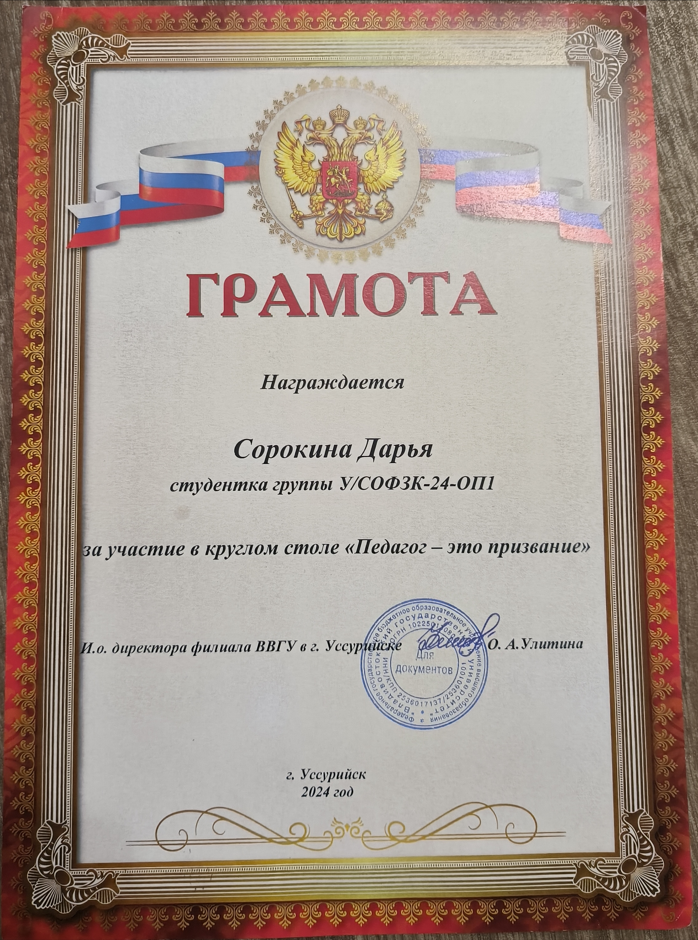Круглый стол "Педагог-это призвание" | Внутривузовский | 20.12.2024 | Участник |