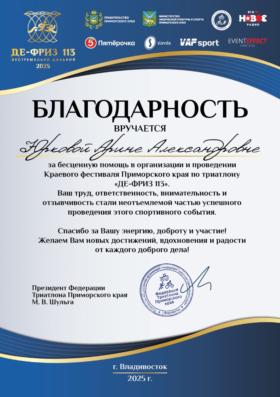 Краевой фестиваль Приморского края по триатлону «ДЕ-ФРИЗ 113» | Городской, краевой | 05.07.2025 | Участник |