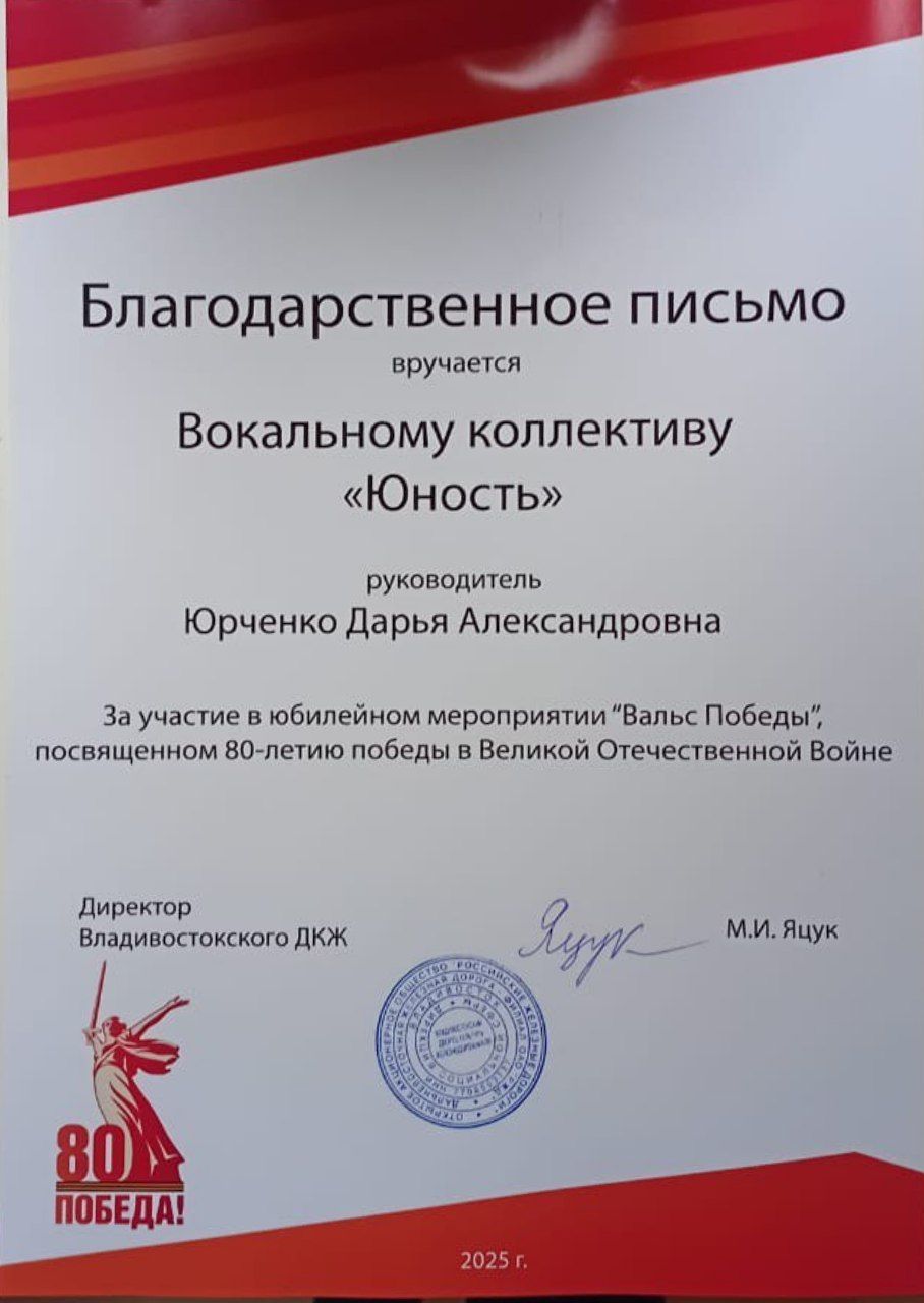 Юбилейное мероприятие "Вальс Победы", посвященное 80-летию победы в Великой Отечественной Войне | Городской, краевой | 07.05.2025 | Участник |