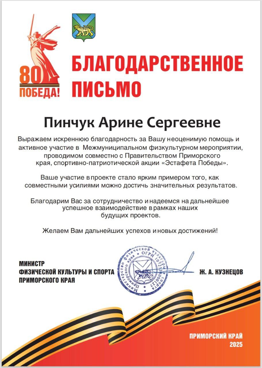 Спортивно-патриотическая акция "Эстафета Победы" | Городской, краевой | 08.05.2025 | Участник |