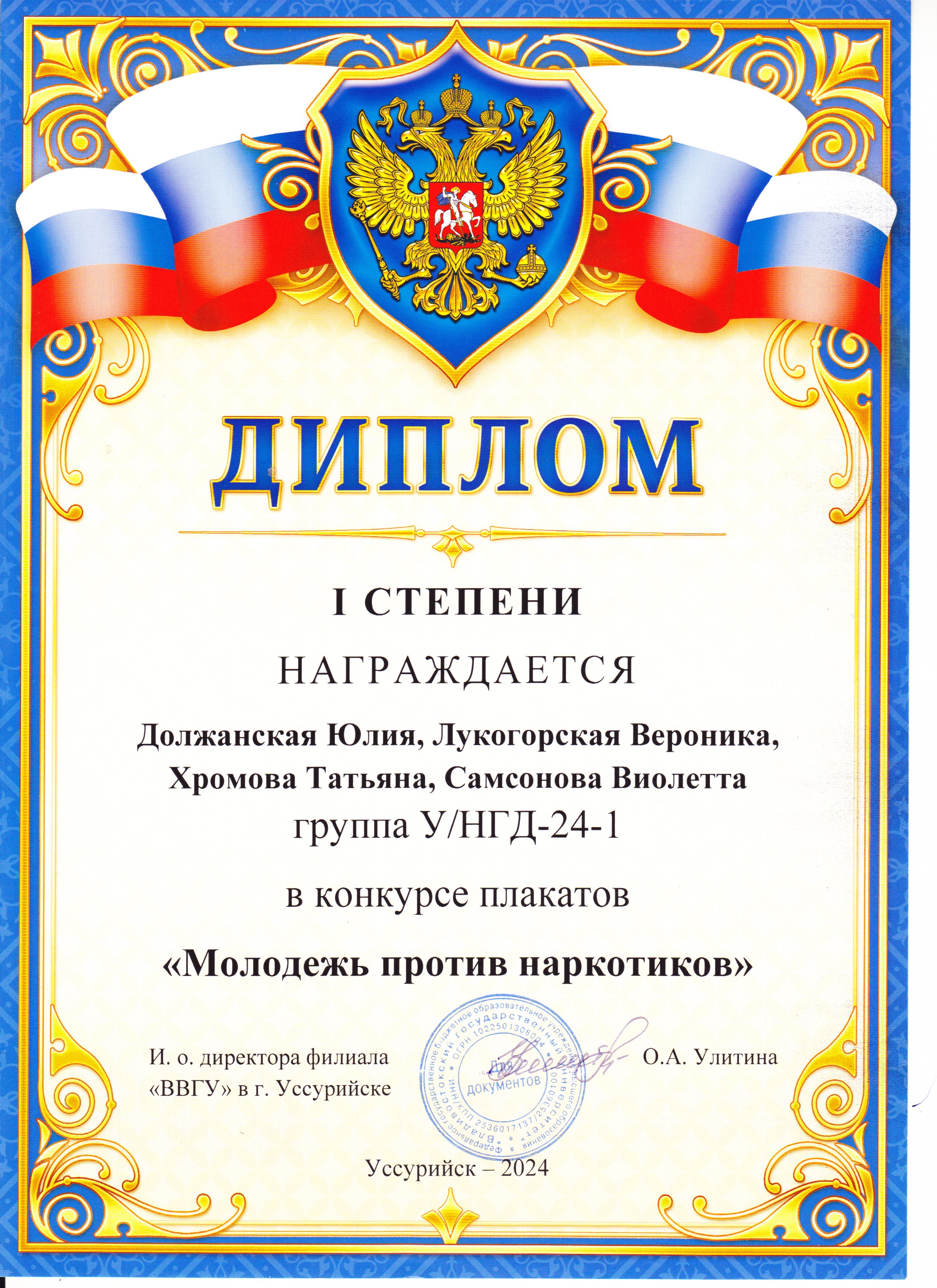 | Конкурс плакатов "Молодёжь против наркотиков" | Внутривузовский | 15.11.2024 | 1 место или гран-при |