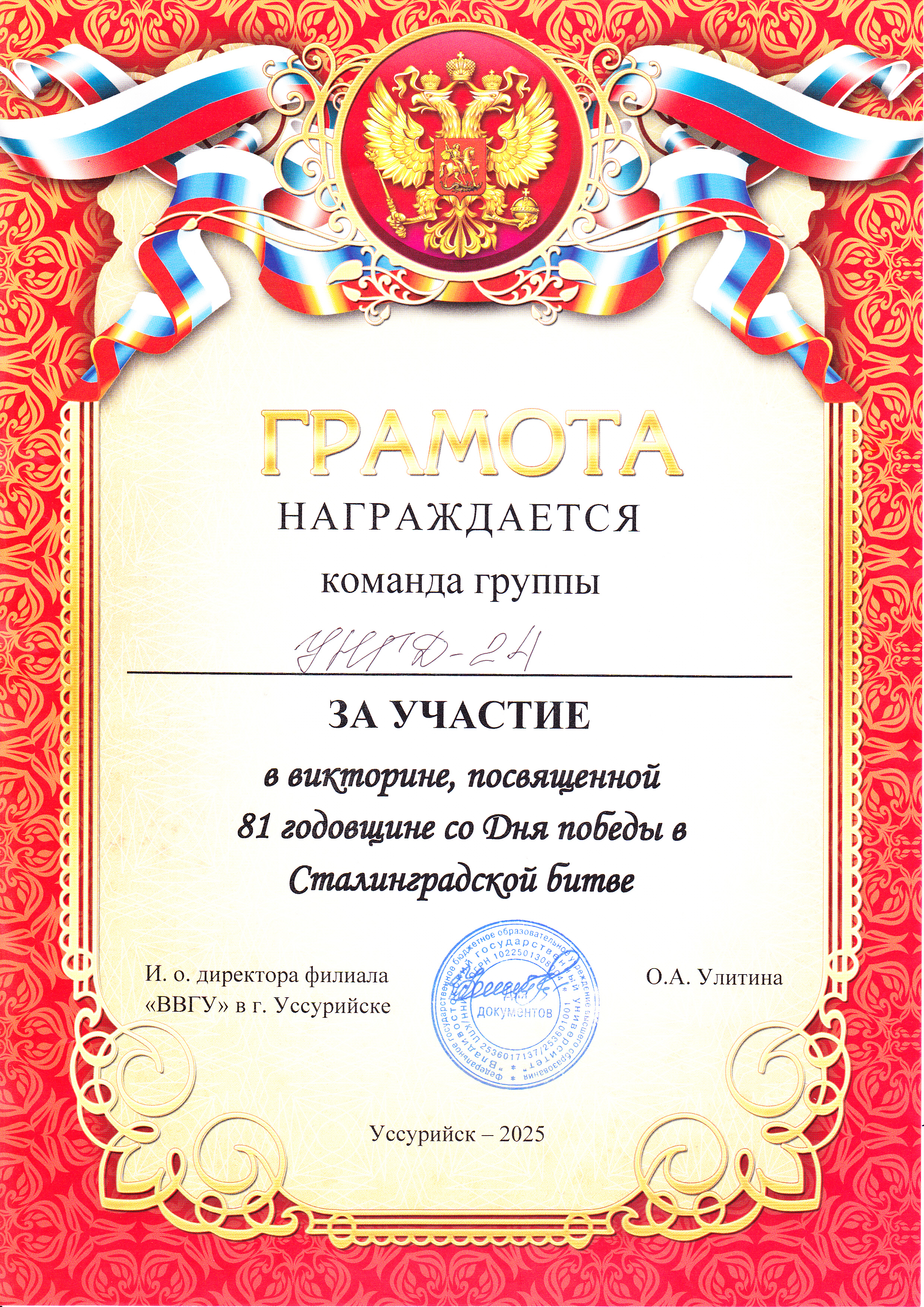 | Викторина, посвящённая 81 годовщине со дня победы в Сталинградской битве | Внутривузовский | 27.01.2025 | Участник |