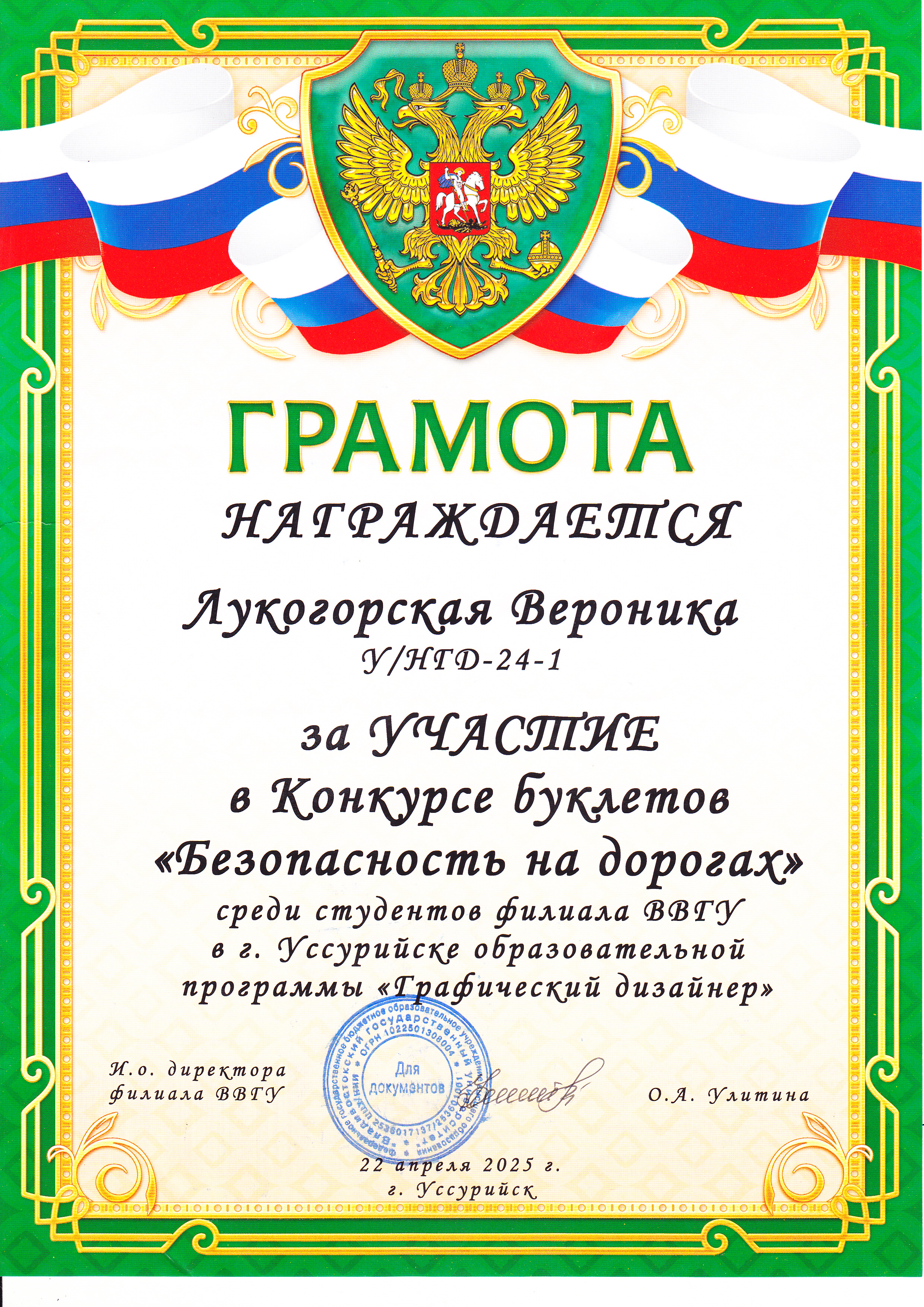 | Конкурс буклетов "безопасность на дорогах" | Внутривузовский | 20.05.2025 | Участник |