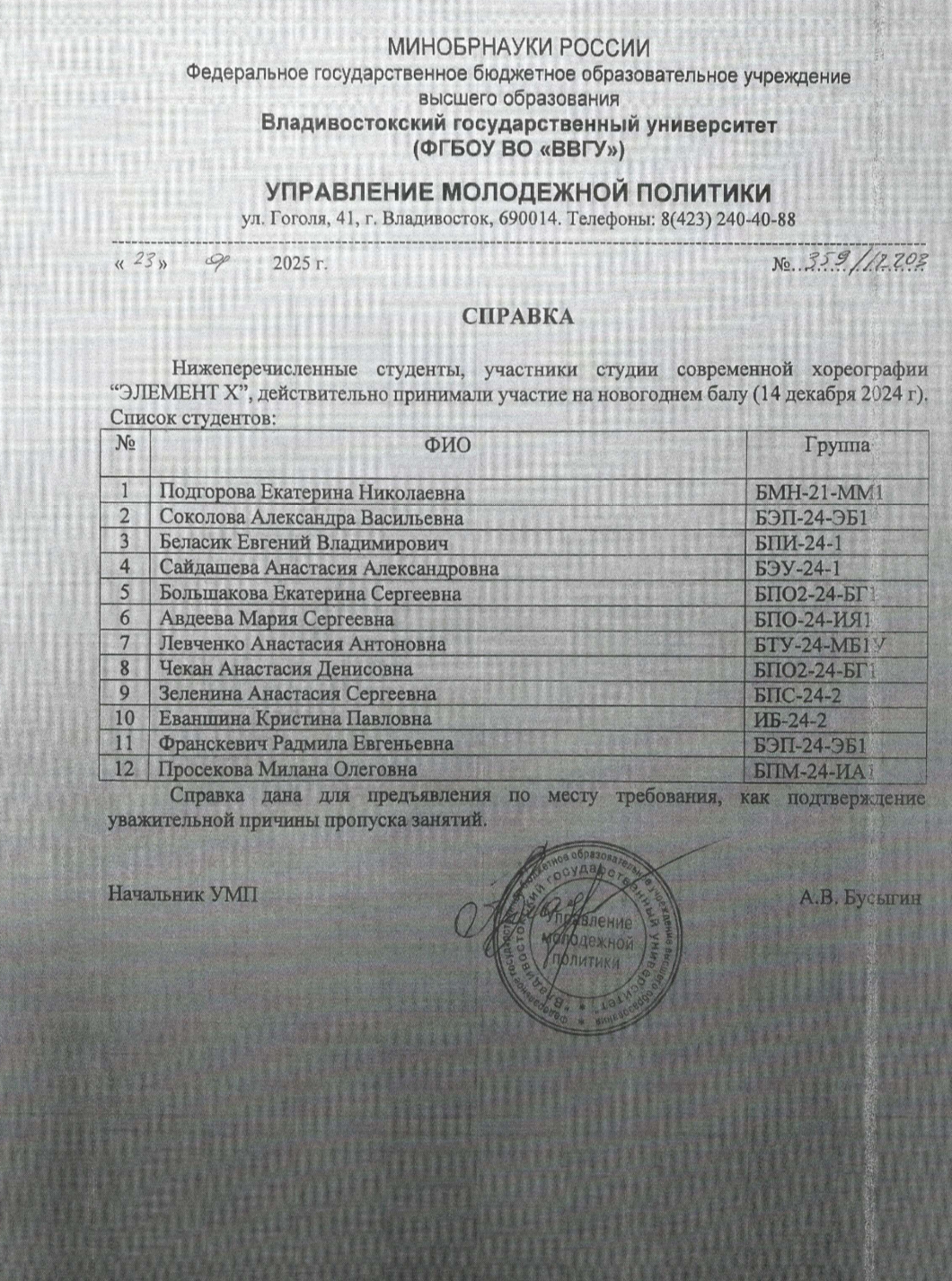 — Подтверждено ВВГУ |