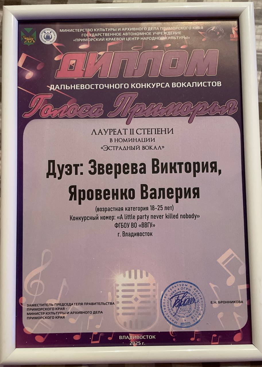 Дальневосточный конкурс вокалистов «Голос Приморья» | Конкурс | Городской, краевой | 20.03.2025 - 20.03.2025 | 2 место | Справка,диплом | Филатова Анна Ивановна | |