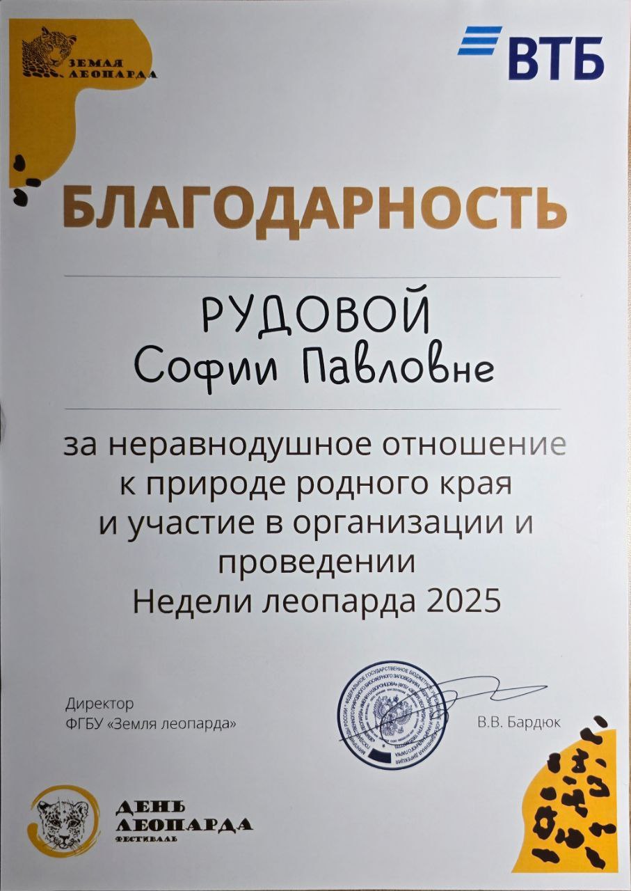 Неделя дальневосточного леопарда Городской, краевой 28.04.2025 - 04.05.2025 Участник благодарственное письмо