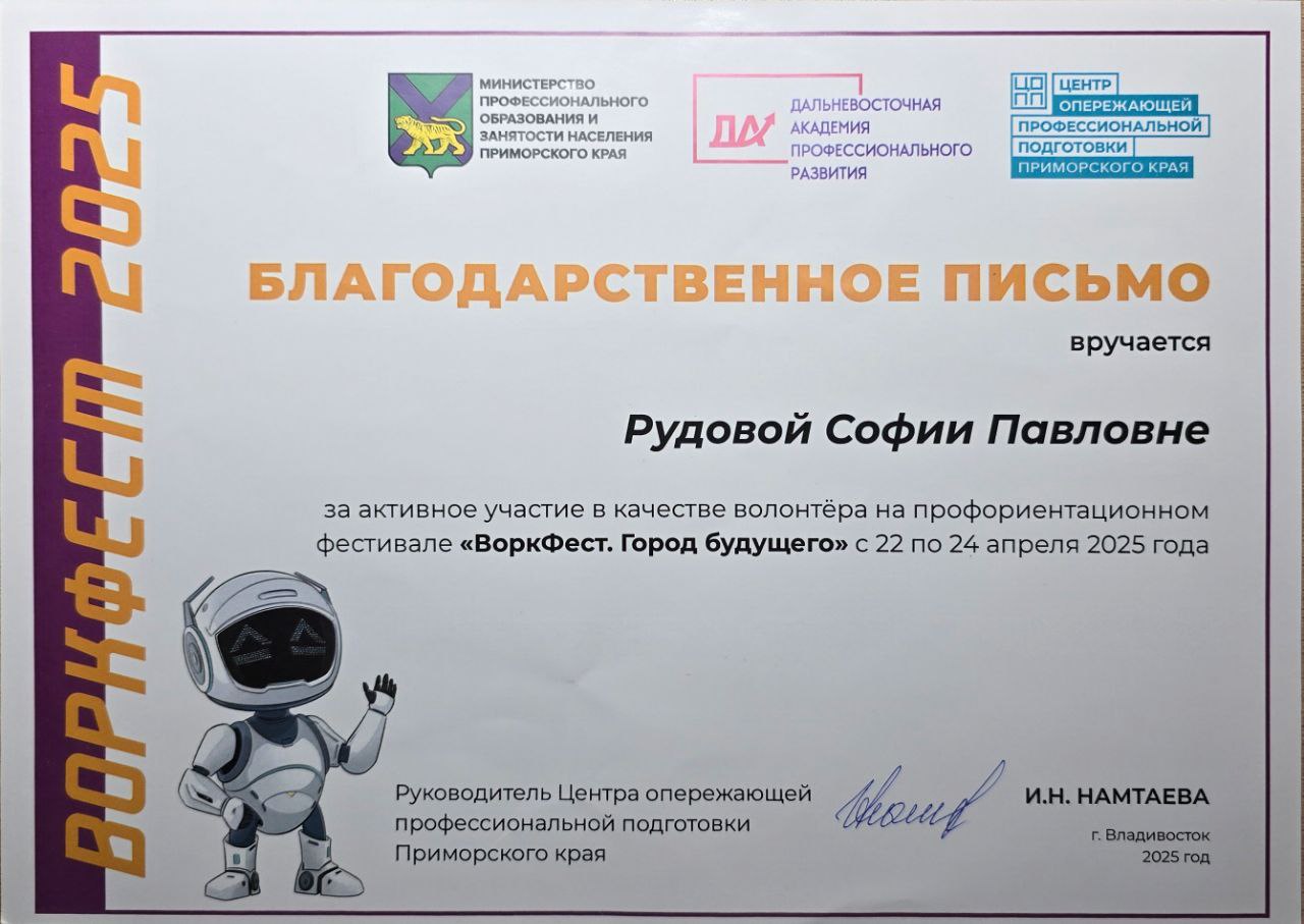фестиваль "ВоркФест. Город будущего" Городской, краевой 22.04.2025 - 24.04.2025 Участник благодарственное письмо