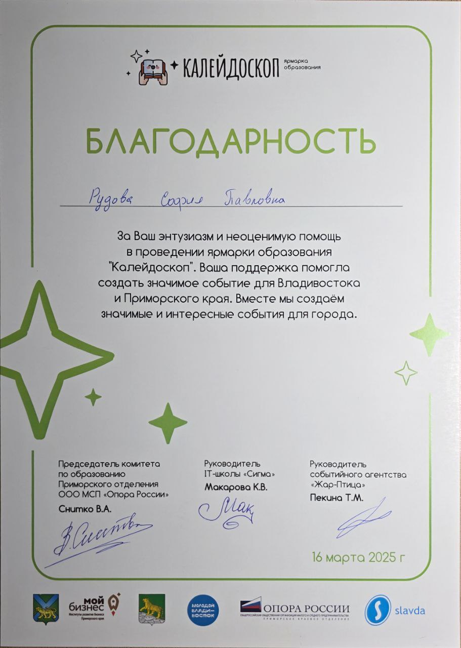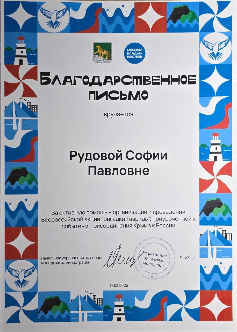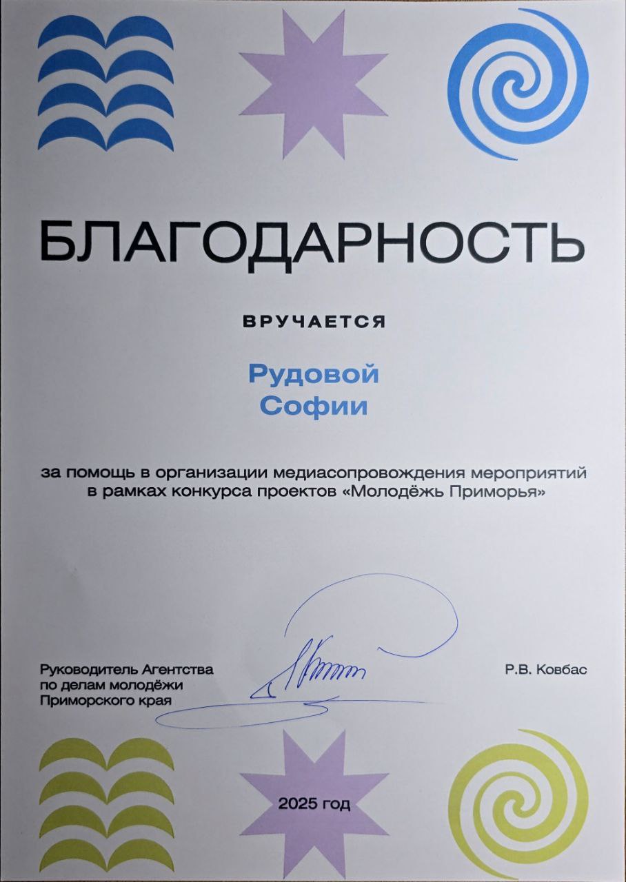 медиасопровождения мероприятий в рамках конкурса проектов «Молодёжь Приморья» Городской, краевой 15.03.2025 - 15.03.2025 Участник Благодарственное письмо