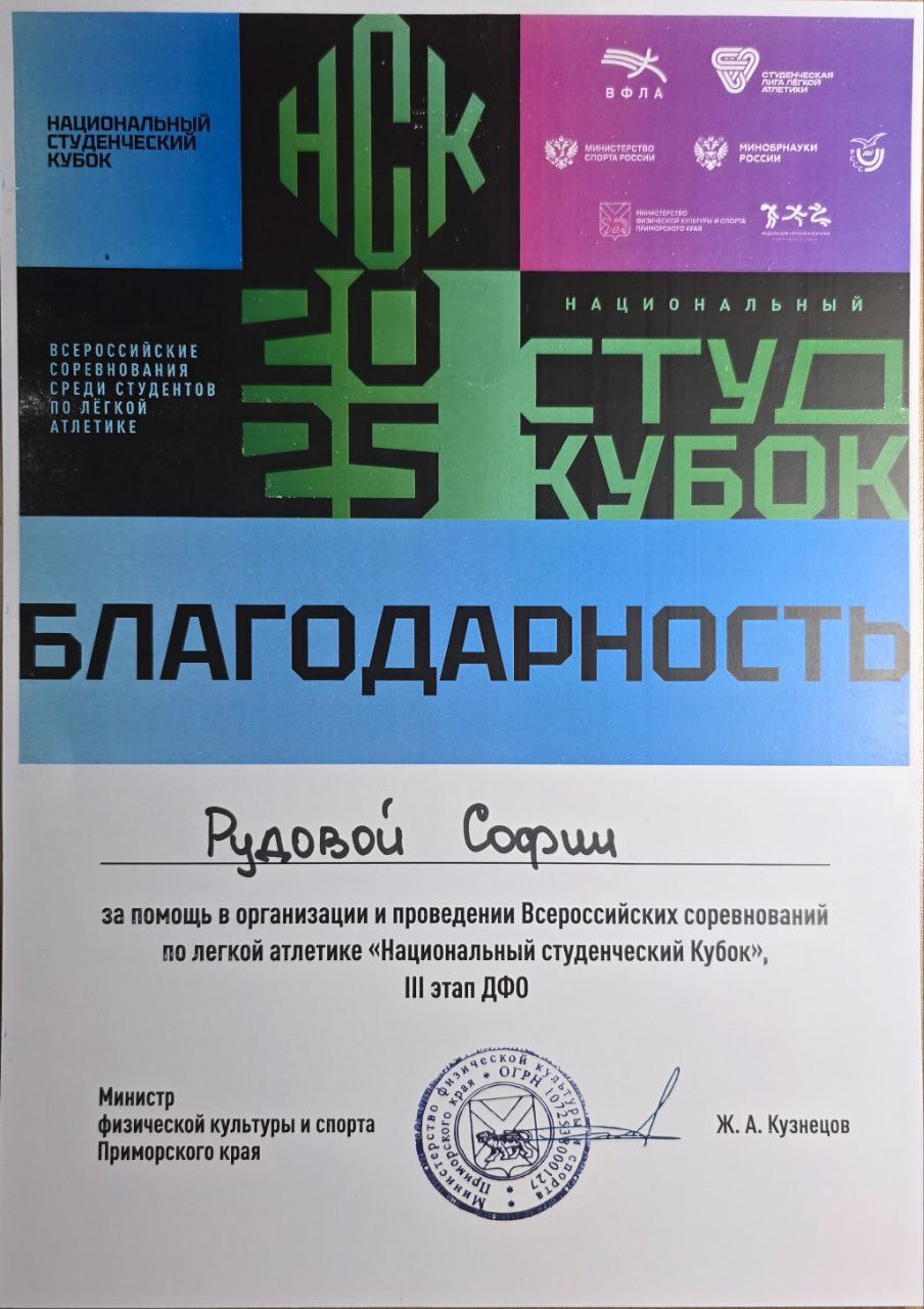 соревнования по легкой атлетике "Национальный студенческий кубок" III этап ДФО Всероссийский 19.03.2025 - 20.03.2025 Участник благодарственное письмо