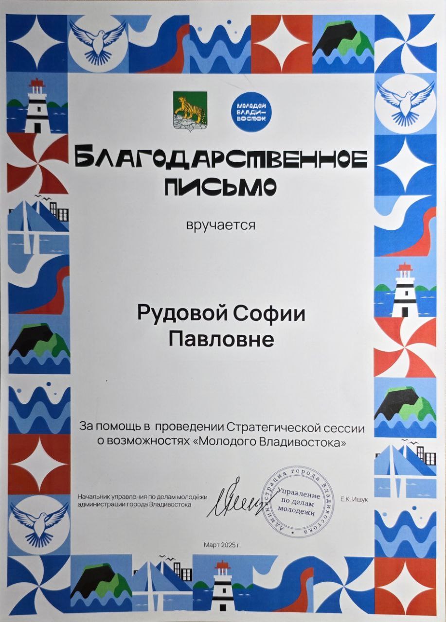 Стратегическая сессия о возможностях "Молодого Владивостока" Городской, краевой 05.03.2025 - 05.03.2025 Участник благодарственное письмо