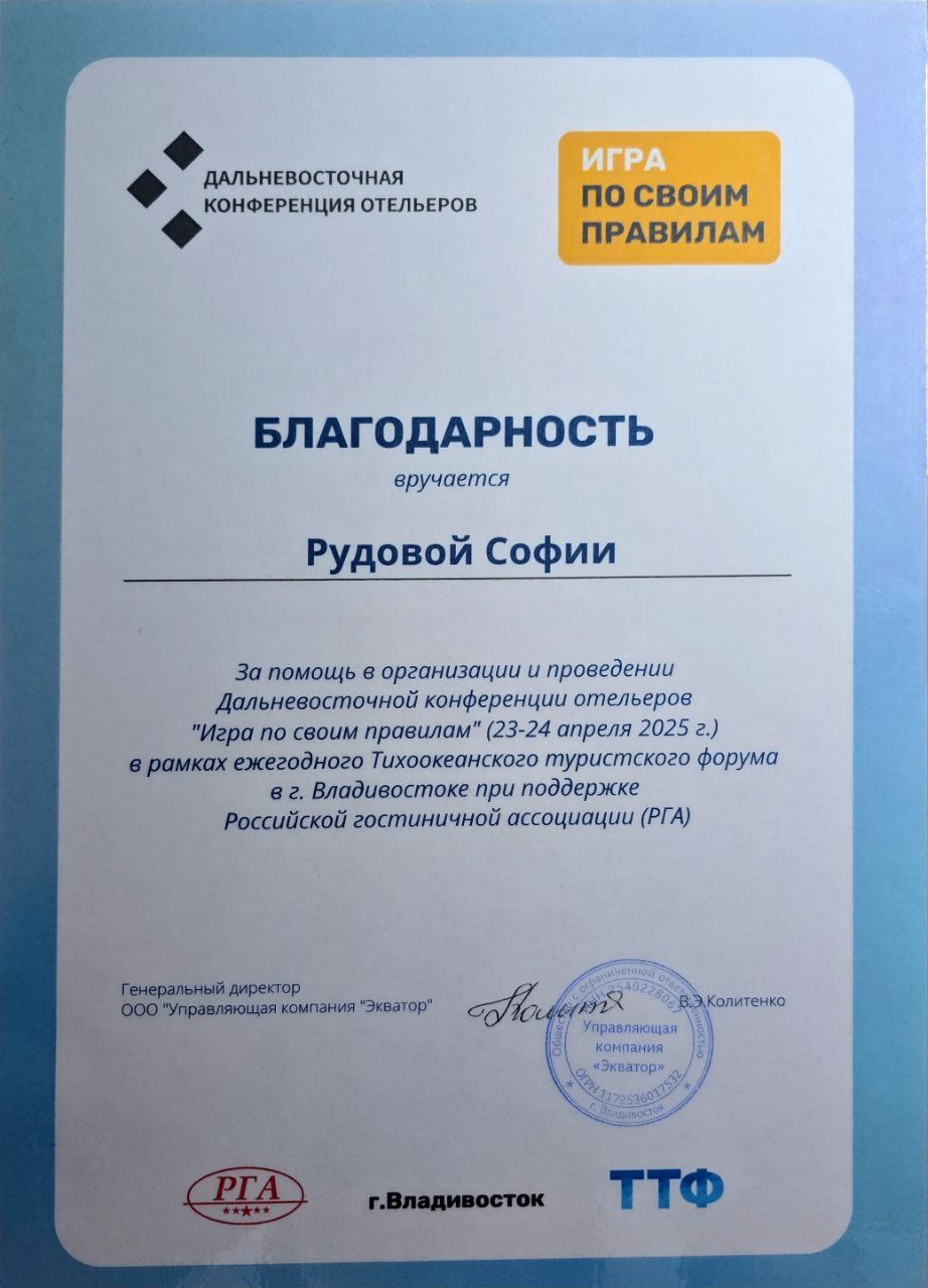 Дальневосточная конференция отельеров 2025: Игра по своим правилам Региональный 23.04.2025 - 24.04.2025 Участник благодарственное письмо