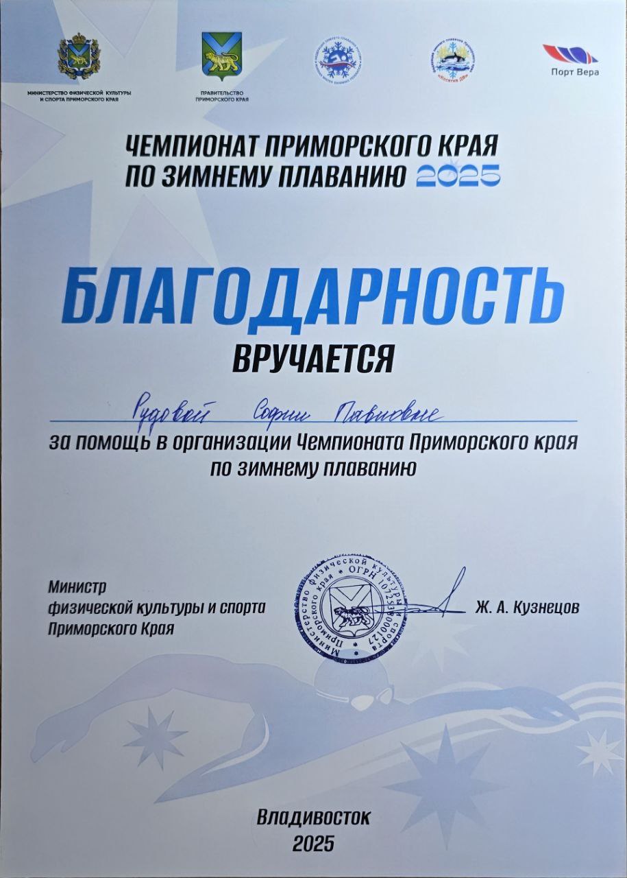 Чемпионат Приморского края по зимнему плаванию | Городской, краевой | 17.01.2025 - 19.01.2025 | Участник |