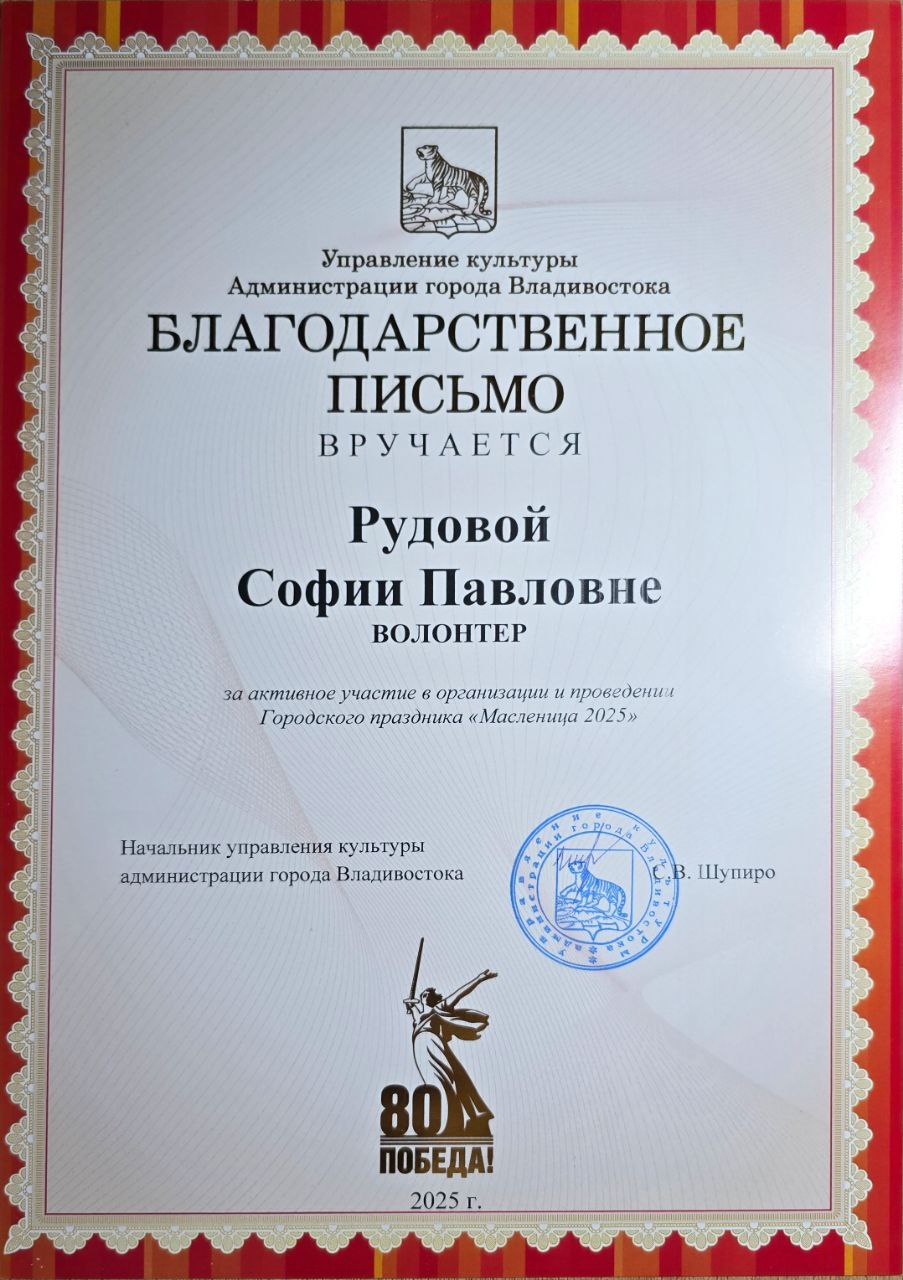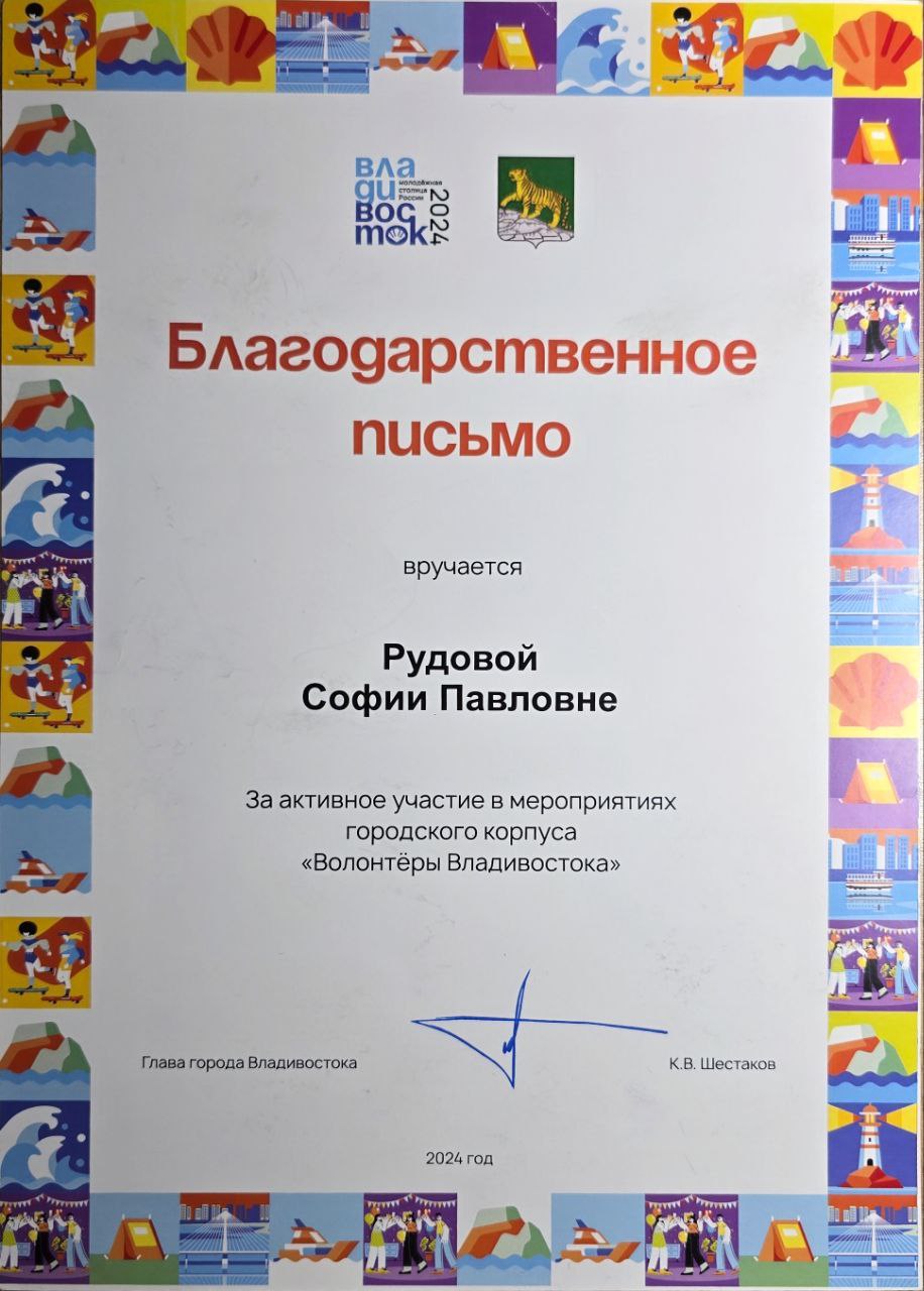 Волонтер Владивостока | награждение | Городской, краевой | 23.11.2024 - 23.11.2024 | Участник |