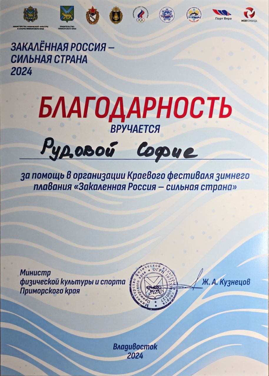 Краевой фестиваль зимнего плавания "Закаленная Россия - сильная страна" | Городской, краевой | 21.12.2024 - 21.12.2024 | Участник |