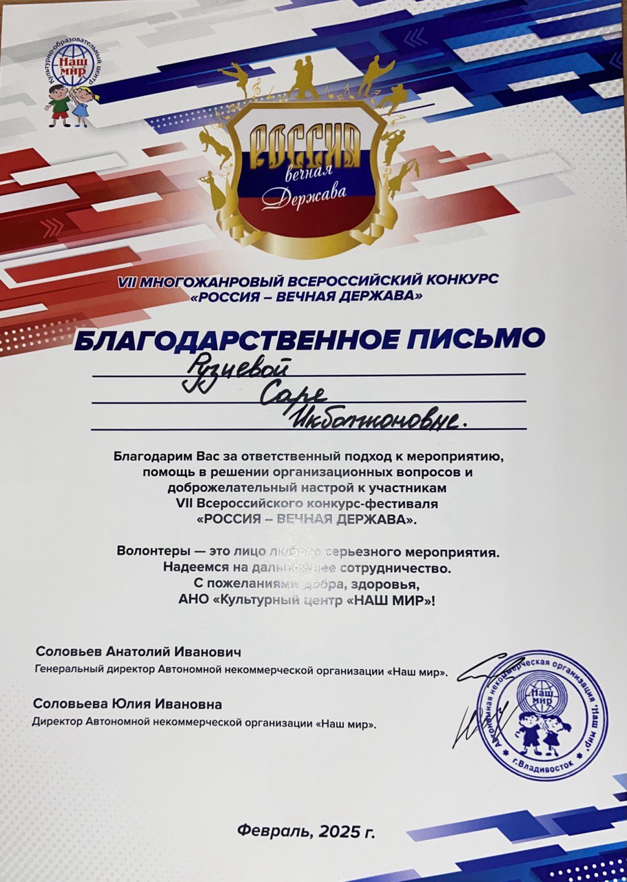 VII Многожанровый Всероссийский конкурс «РОССИЯ – ВЕЧНАЯ ДЕРЖАВА!» | Всероссийский | 08.02.2025 - 11.02.2025 | Участник |