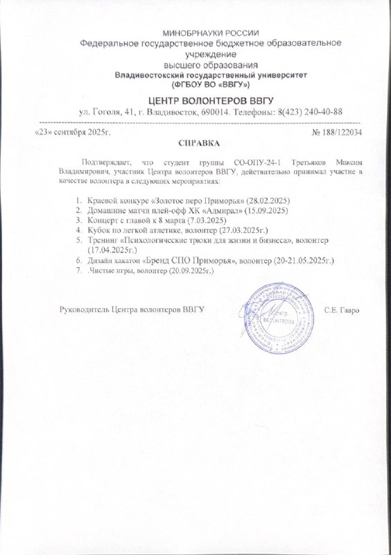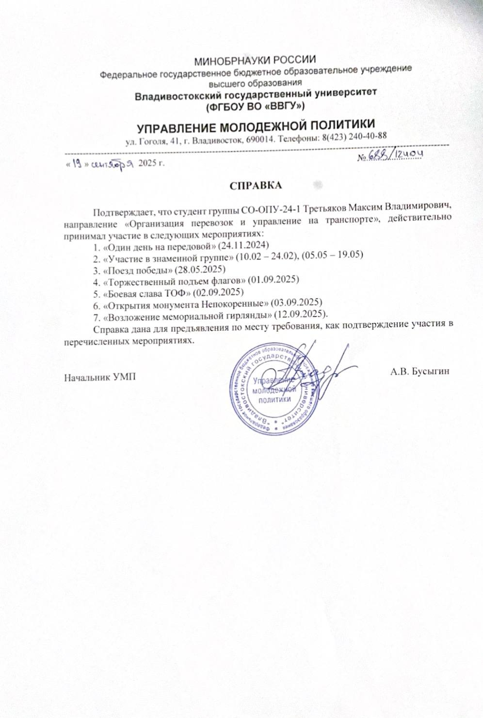 Участие в деятельности юнармейского отряда ФГБОУ ВО "ВВГУ" им. Сергея Ефремова | Внутривузовский | 10.02.2025 - 12.09.2025 | Участник |