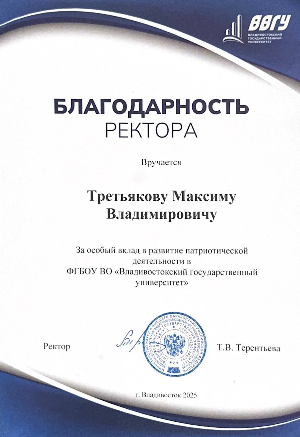 За особый вклад в развитие патриотической деятельности ФГБОУ ВО "Владивостокский государственный университет" | Внутривузовский | 01.10.2024 - 30.06.2025 | Участник |