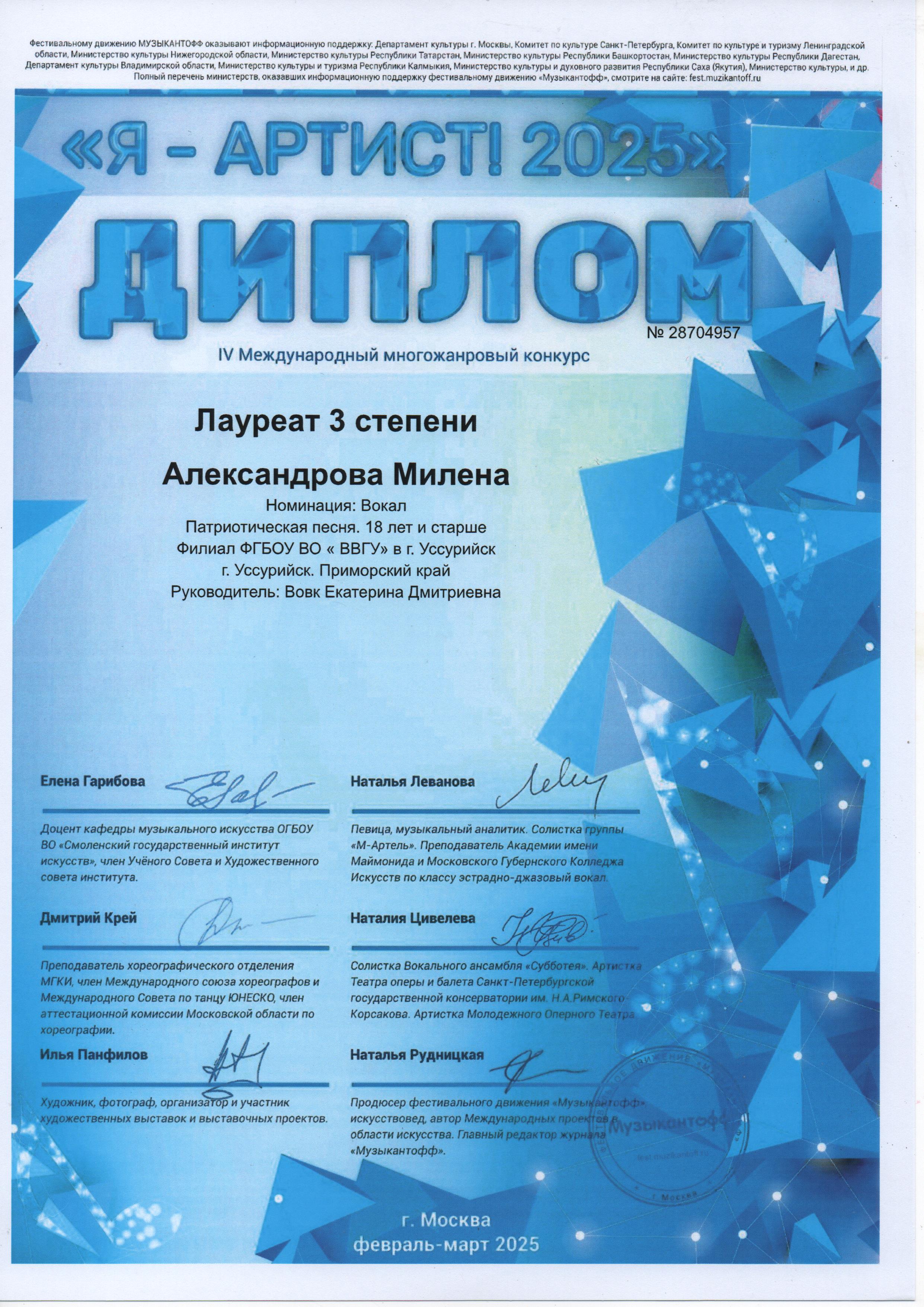 "Я-АРТИСТ! 2025" | многожанровый конкурс | Международный | 15.02.2025 - 20.03.2025 | Лауреат 3 степени |
