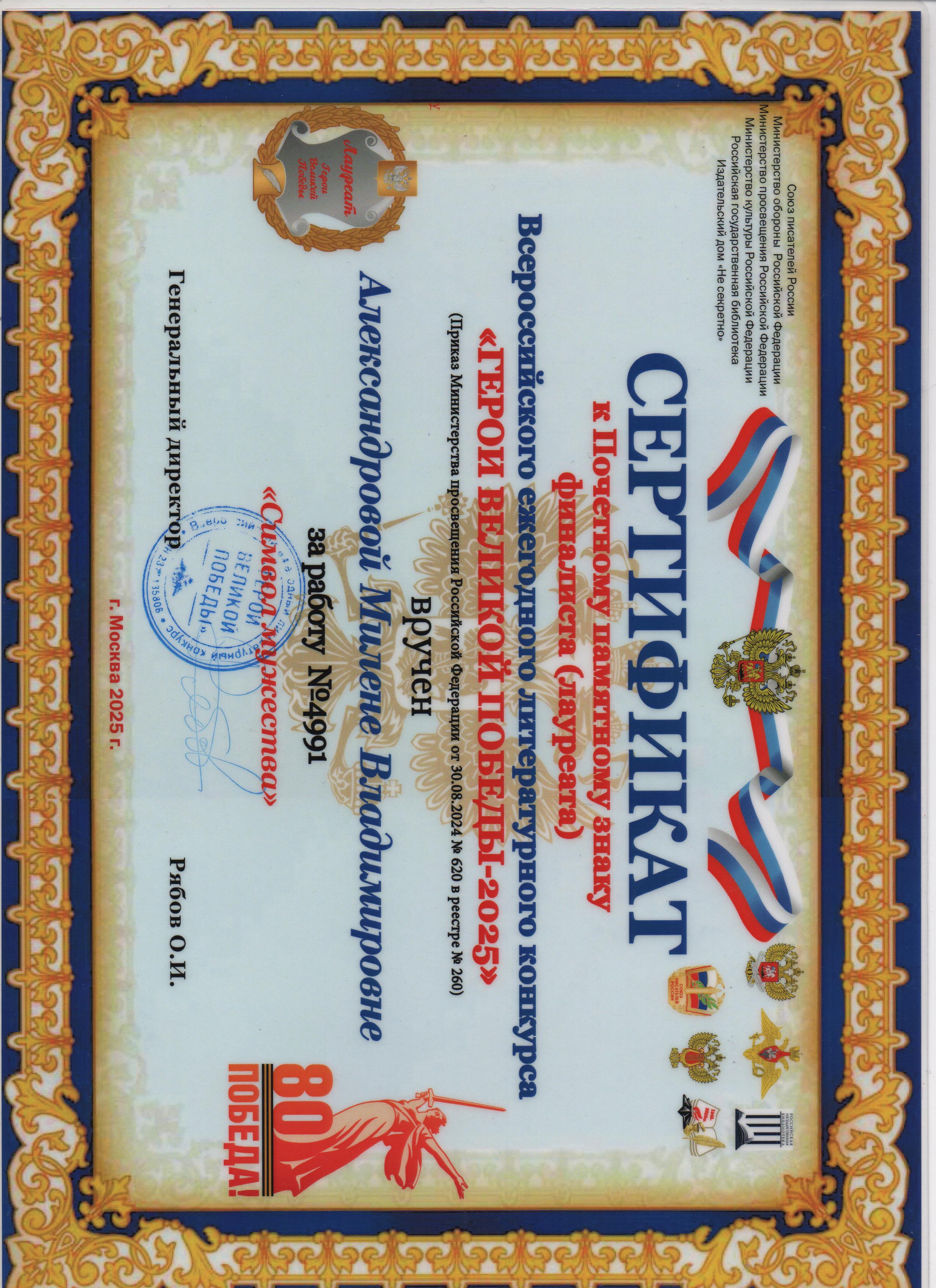 | ежегодный литературный конкурс "ГЕРОИ ВЕЛИКОЙ ПОБЕДЫ 2025" | литературный | Всероссийский | 27.08.2025 | лауреат |