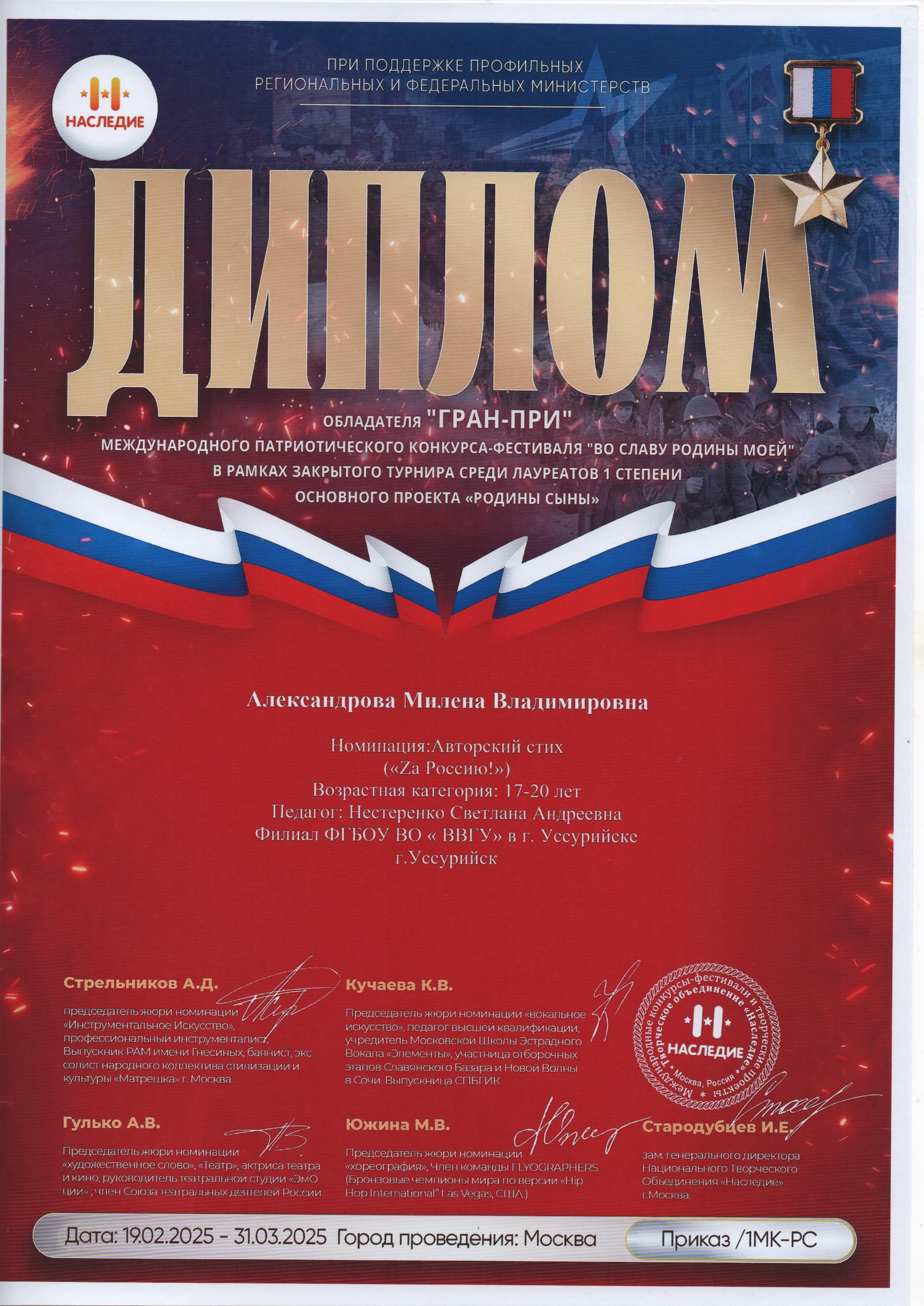 "ВО СЛАВУ РОДИНЫ МОЕЙ" | патриотический конкурс-фестиваль | Международный | 19.02.2025 - 31.03.2025 | ГРАН-ПРИ |