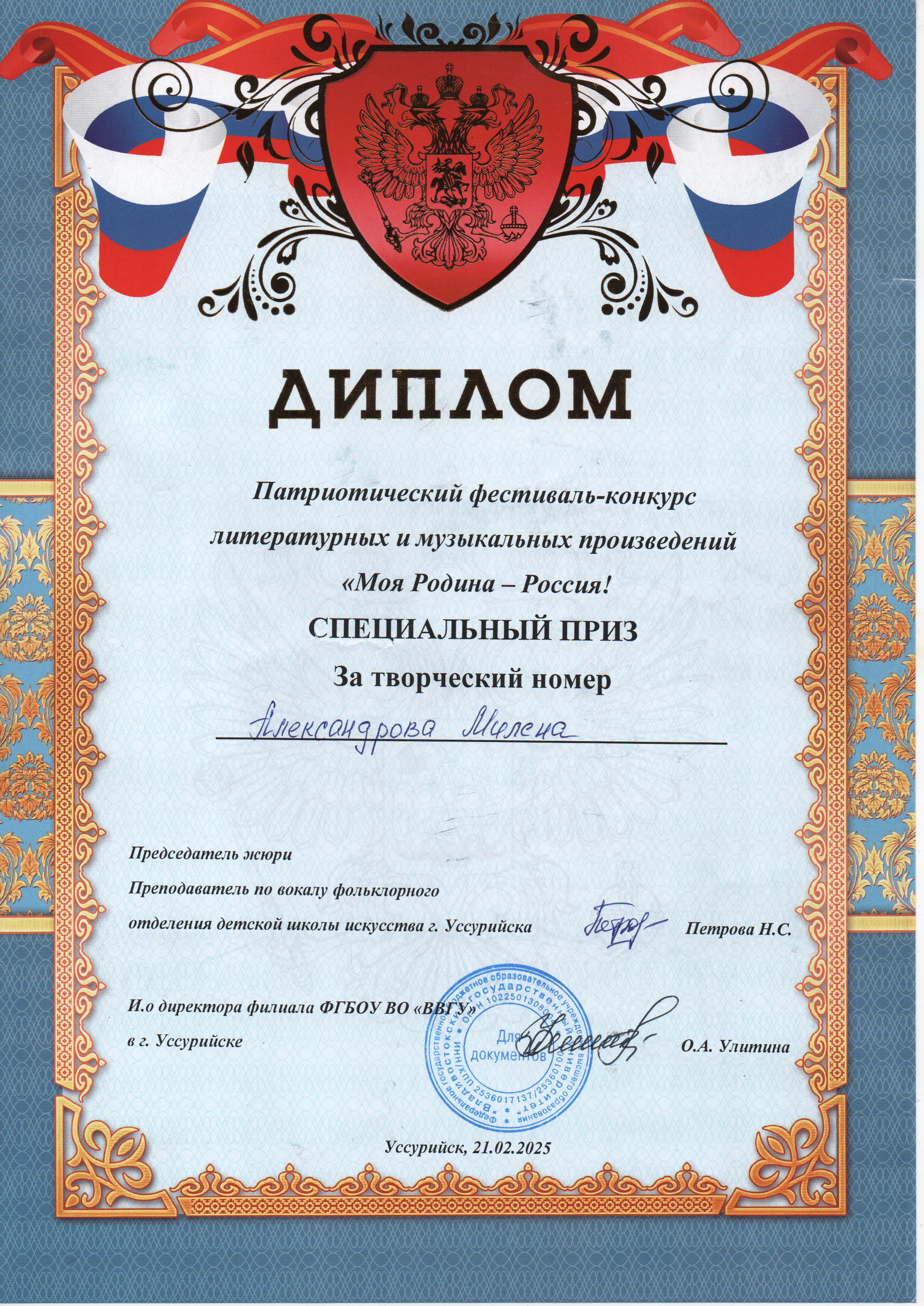 "МОЯ РОДИНА-РОССИЯ!" | патриотический фестиваль-конкурс литературных и музыкальных произведений | Внутривузовский | 21.02.2025 - 21.02.2025 | Специальный приз |