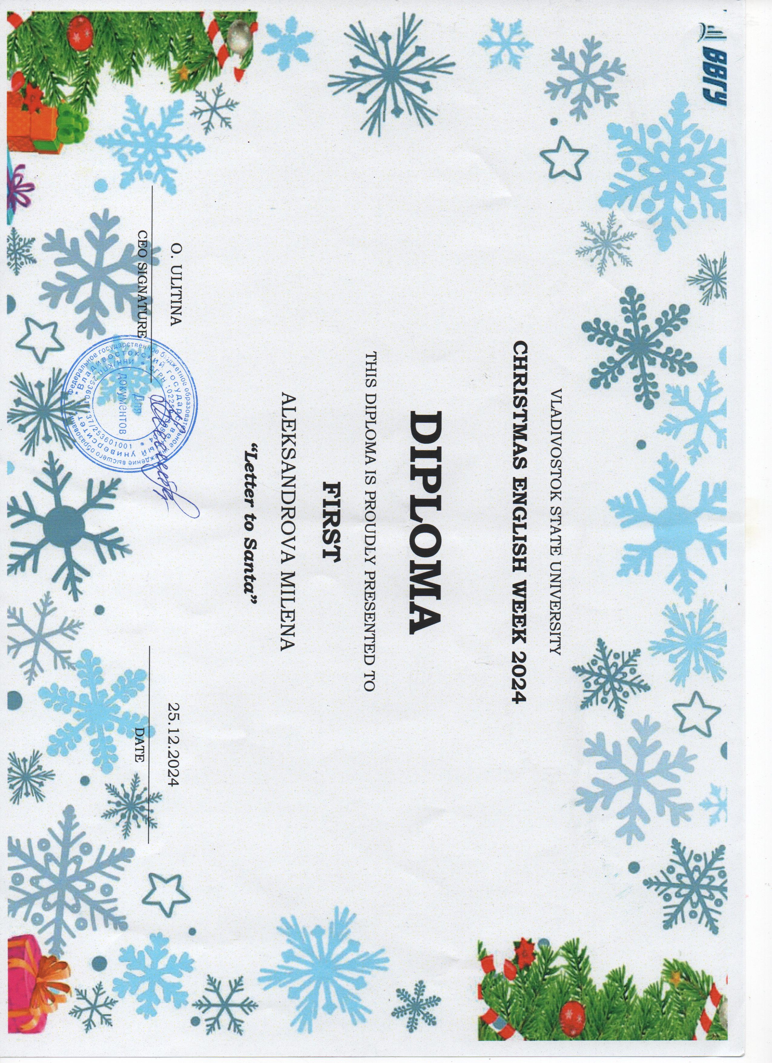 "CHRISTMAS ENGLISH WEEK 2024" | конкурс | Внутривузовский | 25.12.2024 - 25.12.2024 | 1 место |