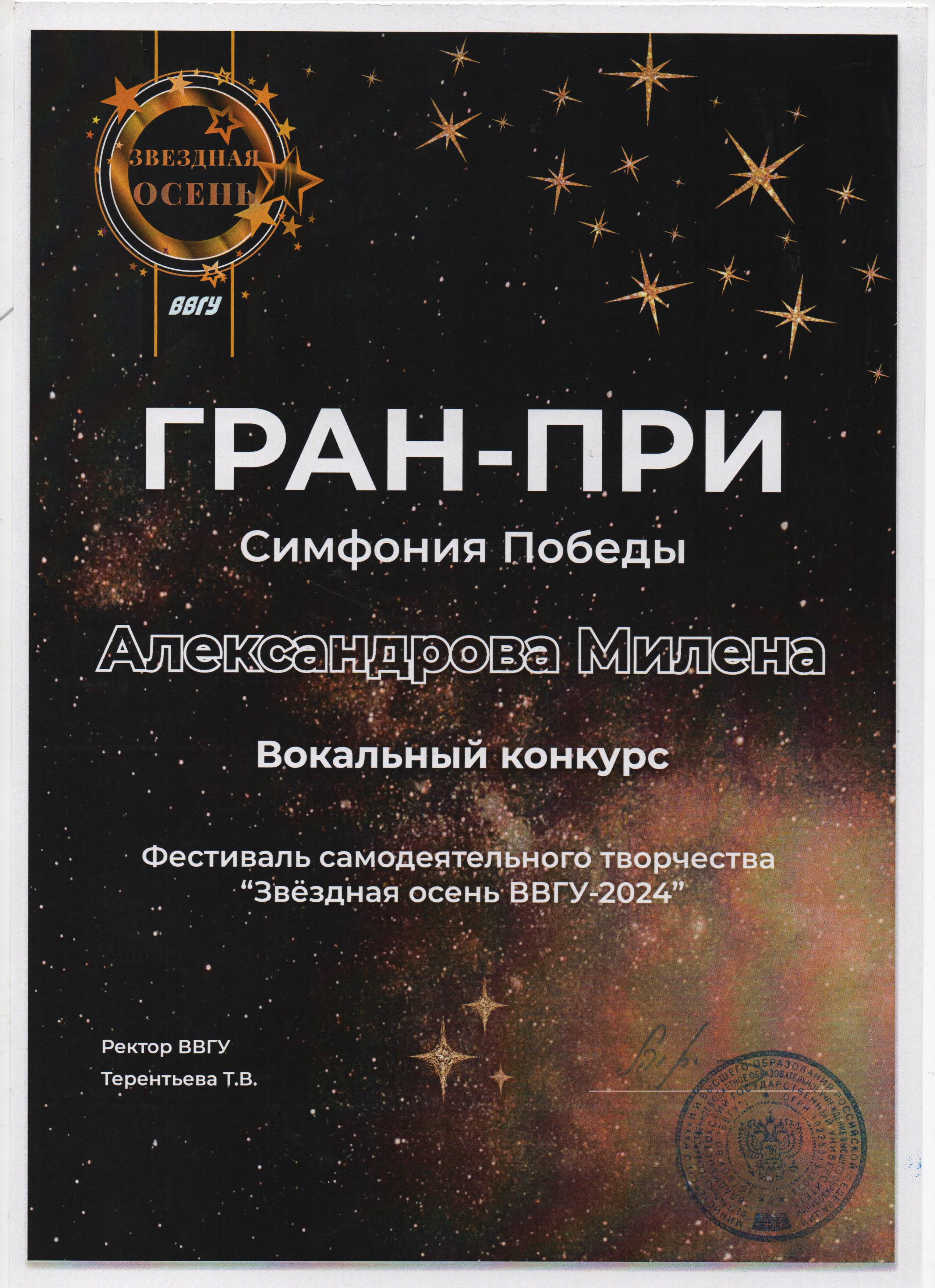 "ЗВЁЗДНАЯ ОСЕНЬ ВВГУ 2024" | фестиваль самодеятельного творчества | Внутривузовский | 20.11.2024 - 20.11.2024 | ГРАН-ПРИ |