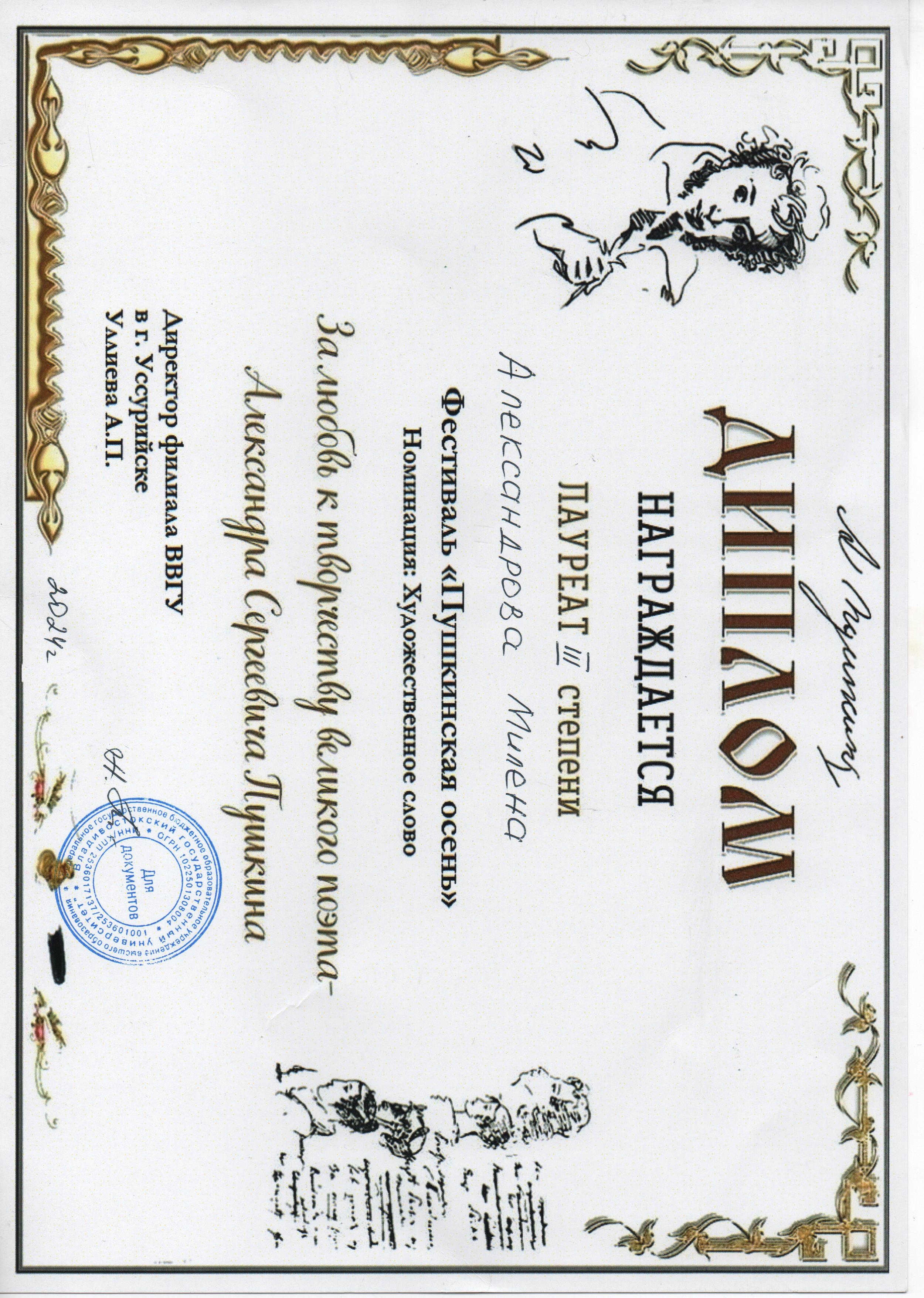 "ПУШКИНСКАЯ ОСЕНЬ" | фестиваль | Внутривузовский | 05.12.2024 - 05.12.2024 | Лауреат 3 степени |