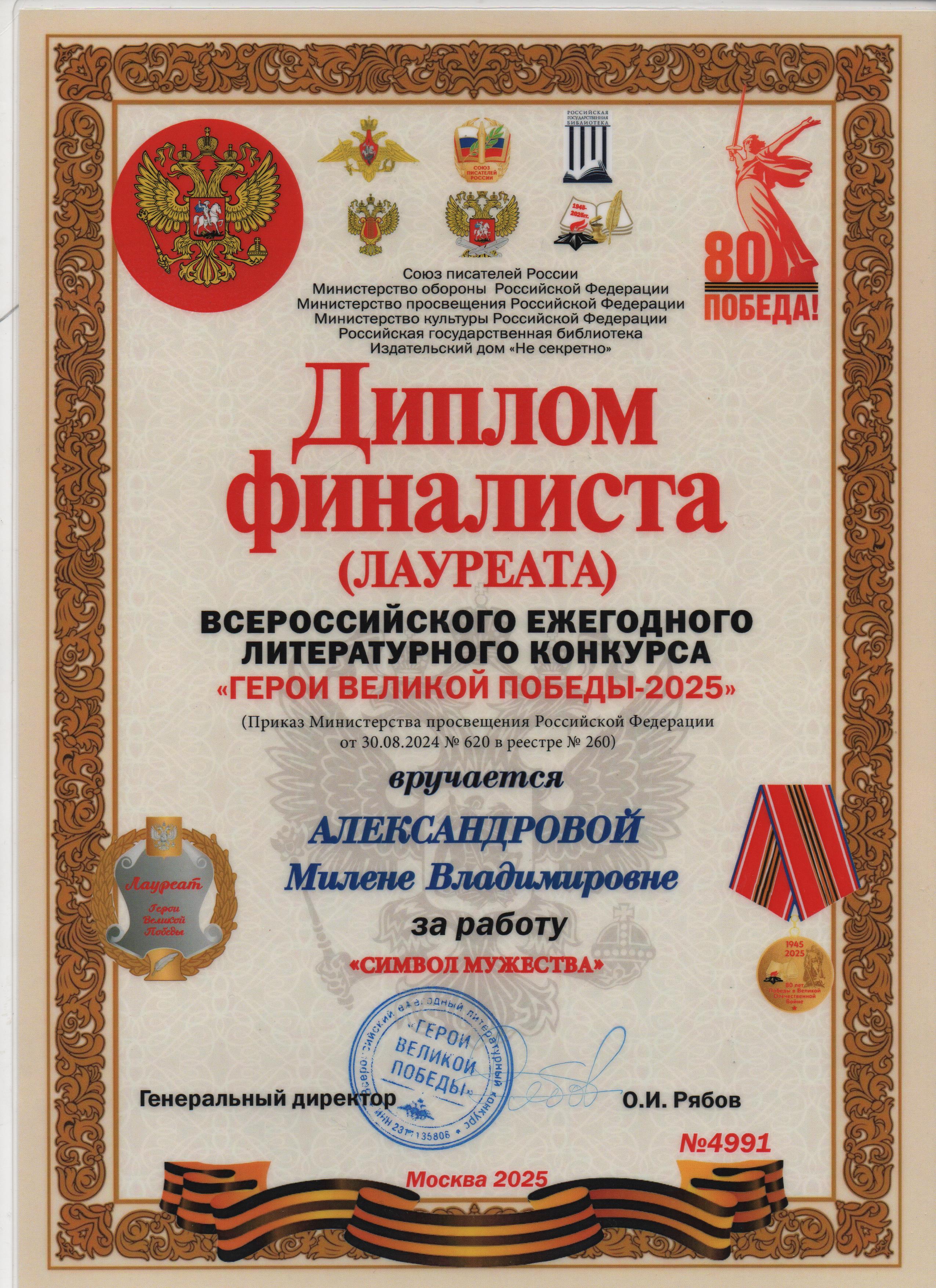 | ежегодный литературный конкурс "ГЕРОИ ВЕЛИКОЙ ПОБЕДЫ 2025" | патриотический | Всероссийский | 25.07.2025 - 20.08.2025 | финалист(лауреат) |