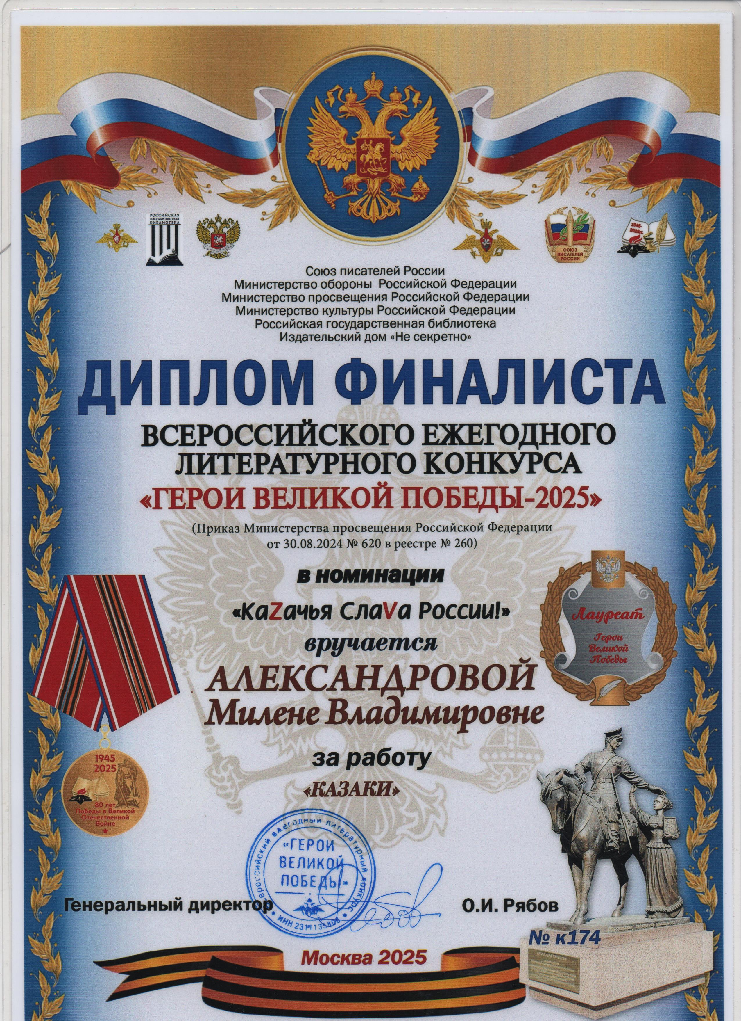 | ежегодный литературный конкурс "ГЕРОИ ВЕЛИКОЙ ПОБЕДЫ 2025" номинация "КАЗАЧЬЯ СЛАВА" | литературный патриотический | Всероссийский | 26.07.2025 - 28.08.2025 | финалист(лауреат) |