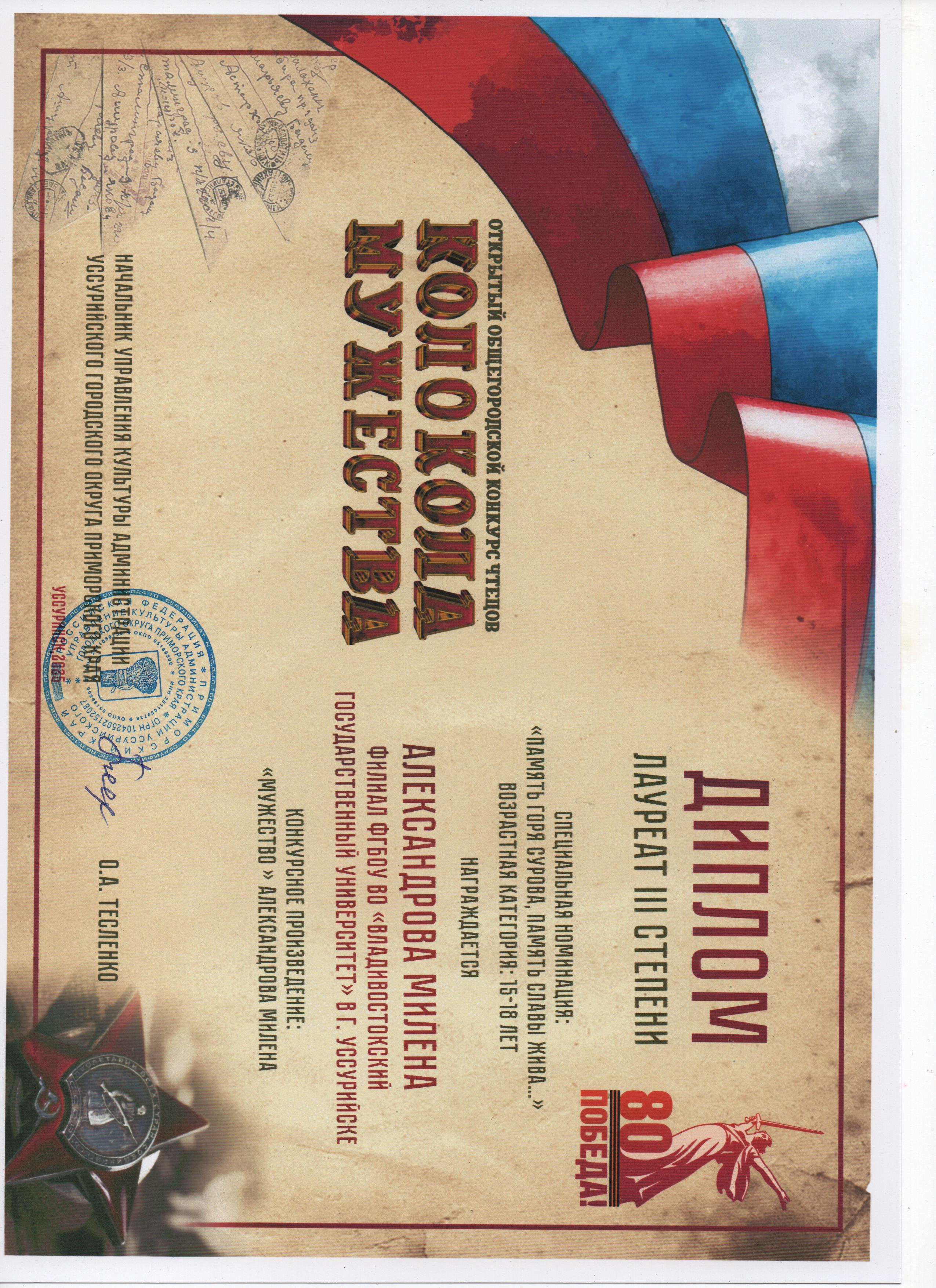 "КОЛОКОЛА МУЖЕСТВА" | конкурс чтецов | Городской, краевой | 22.02.2025 - 22.02.2025 | Лауреат 3 степени |